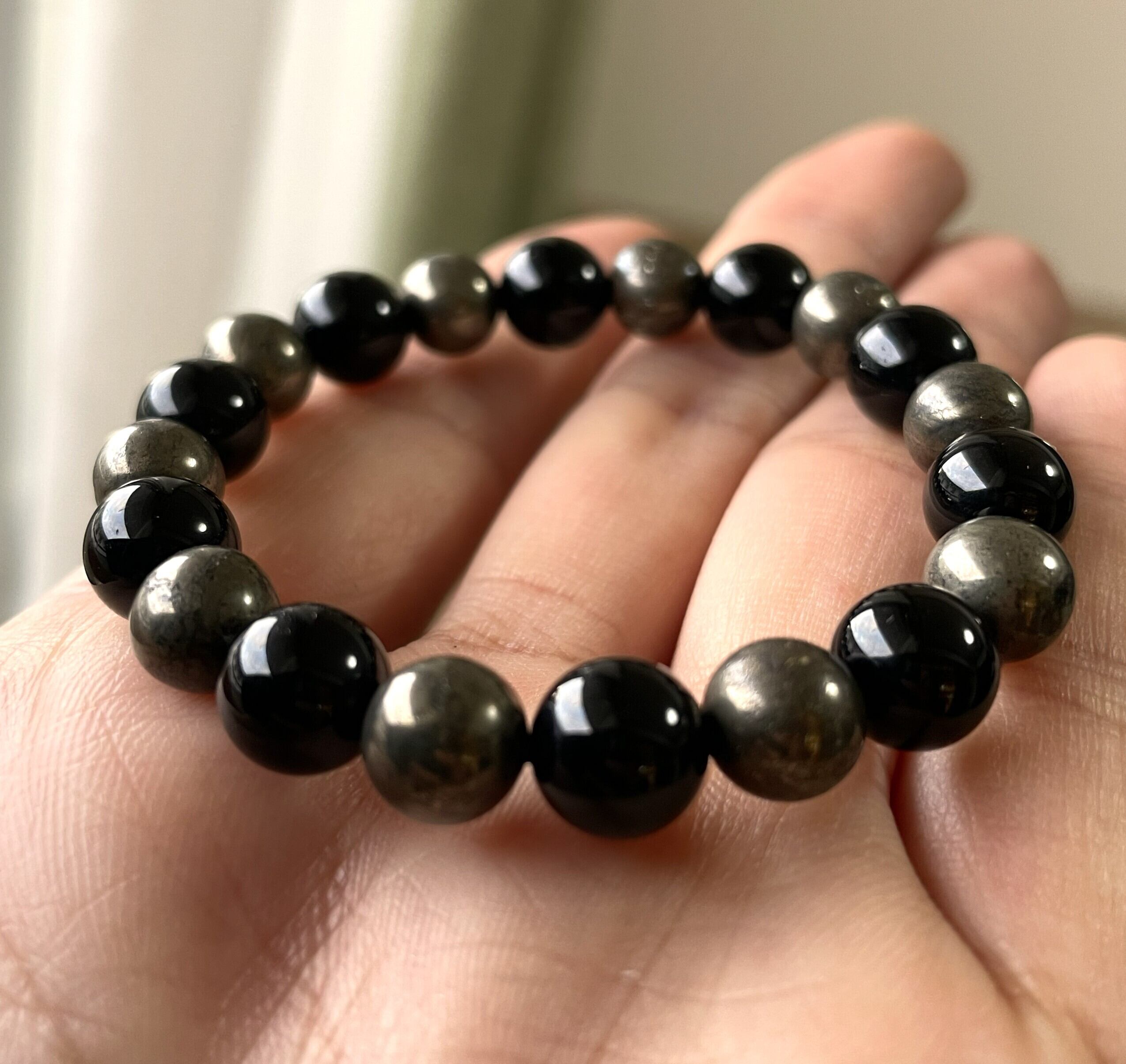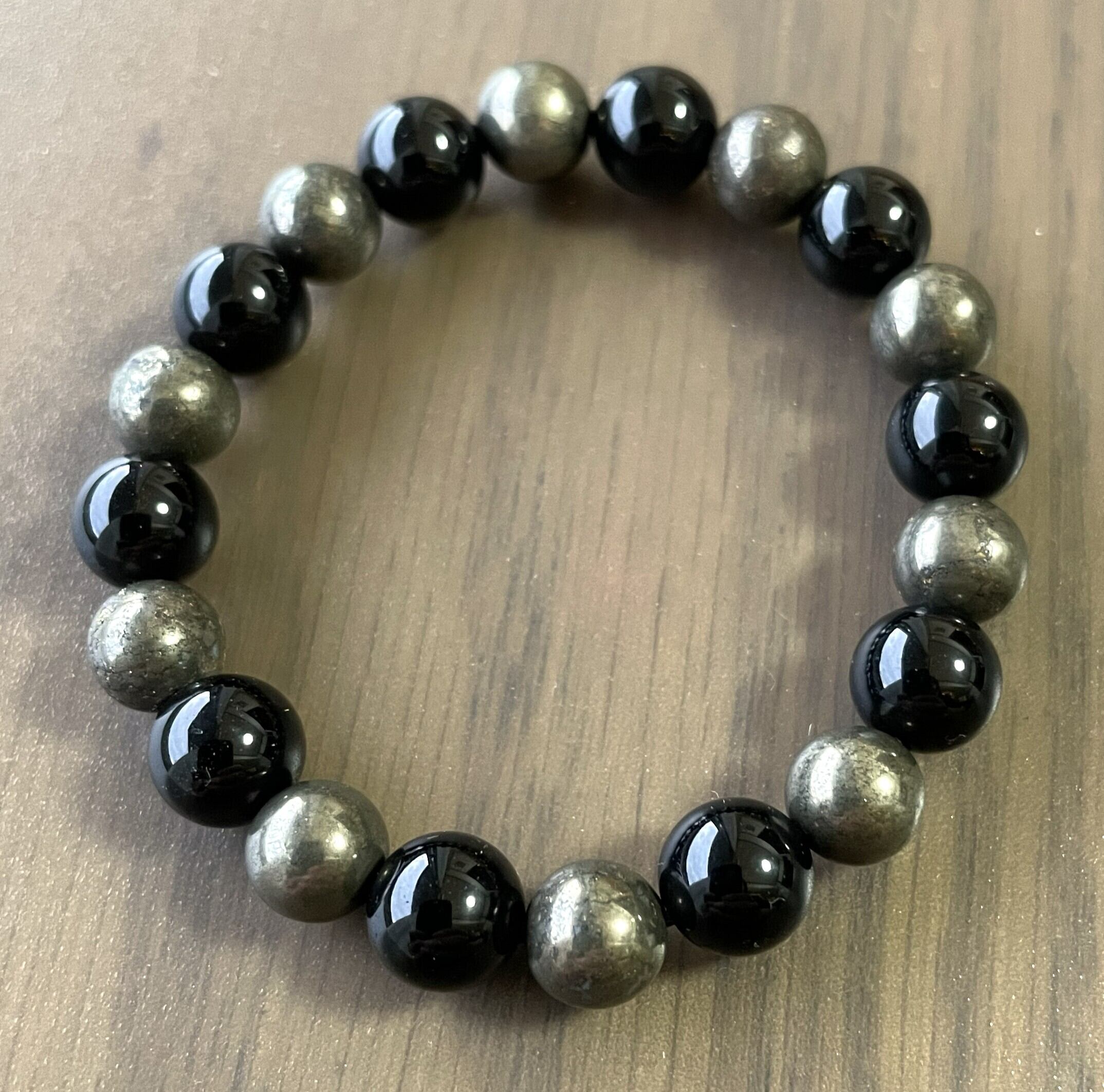 モリオン(黒水晶)&パイライト(黄鉄鉱)の強い石たちを構成し制作したブレスレットです。