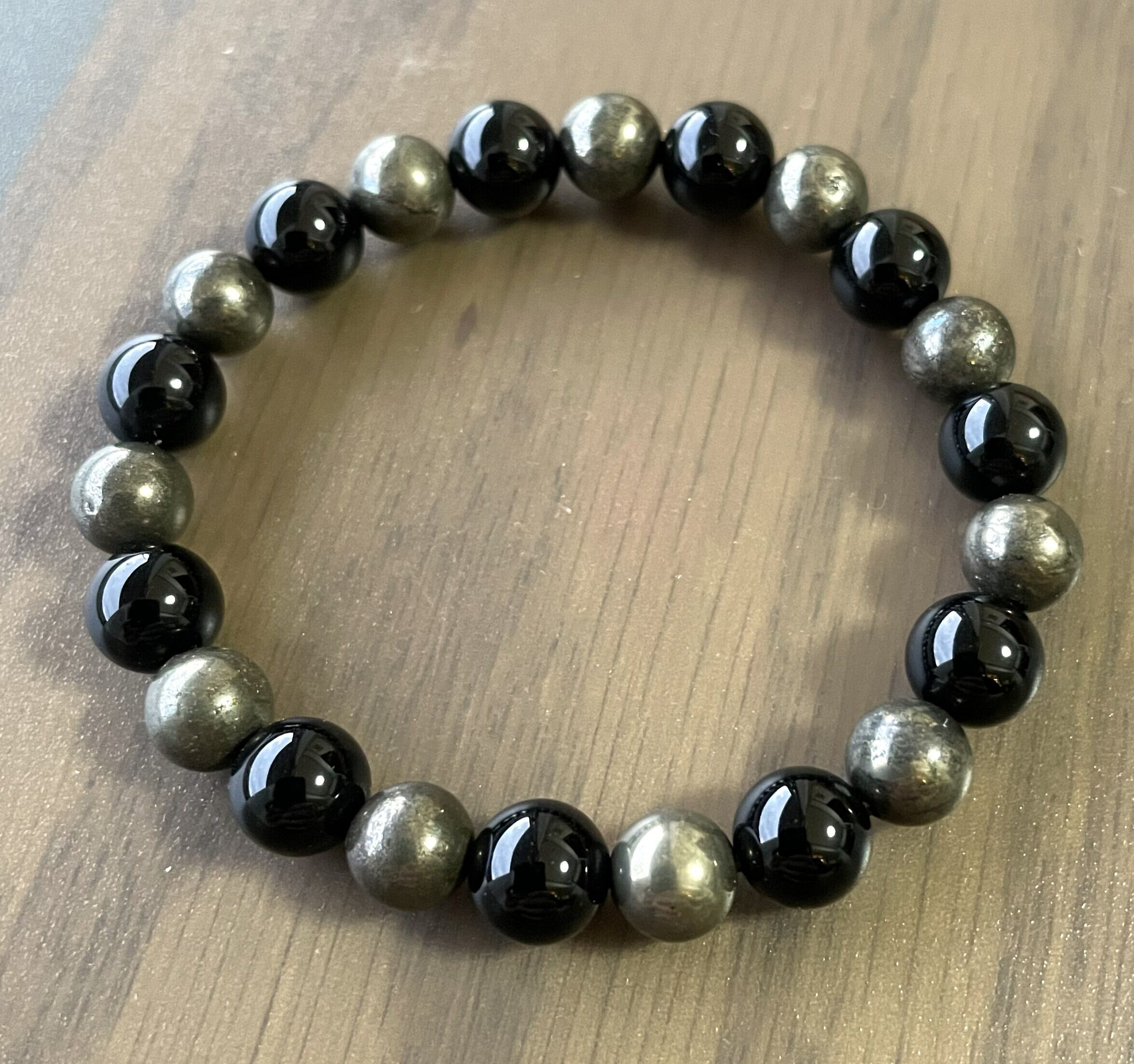 モリオン(黒水晶)&パイライト(黄鉄鉱)の強い石たちを構成し制作したブレスレットです。