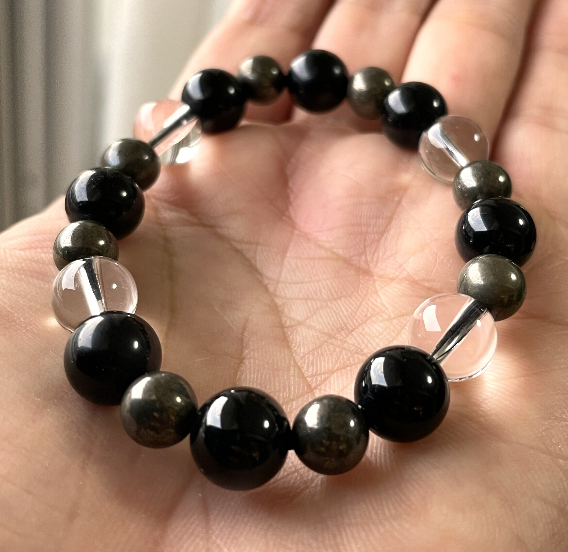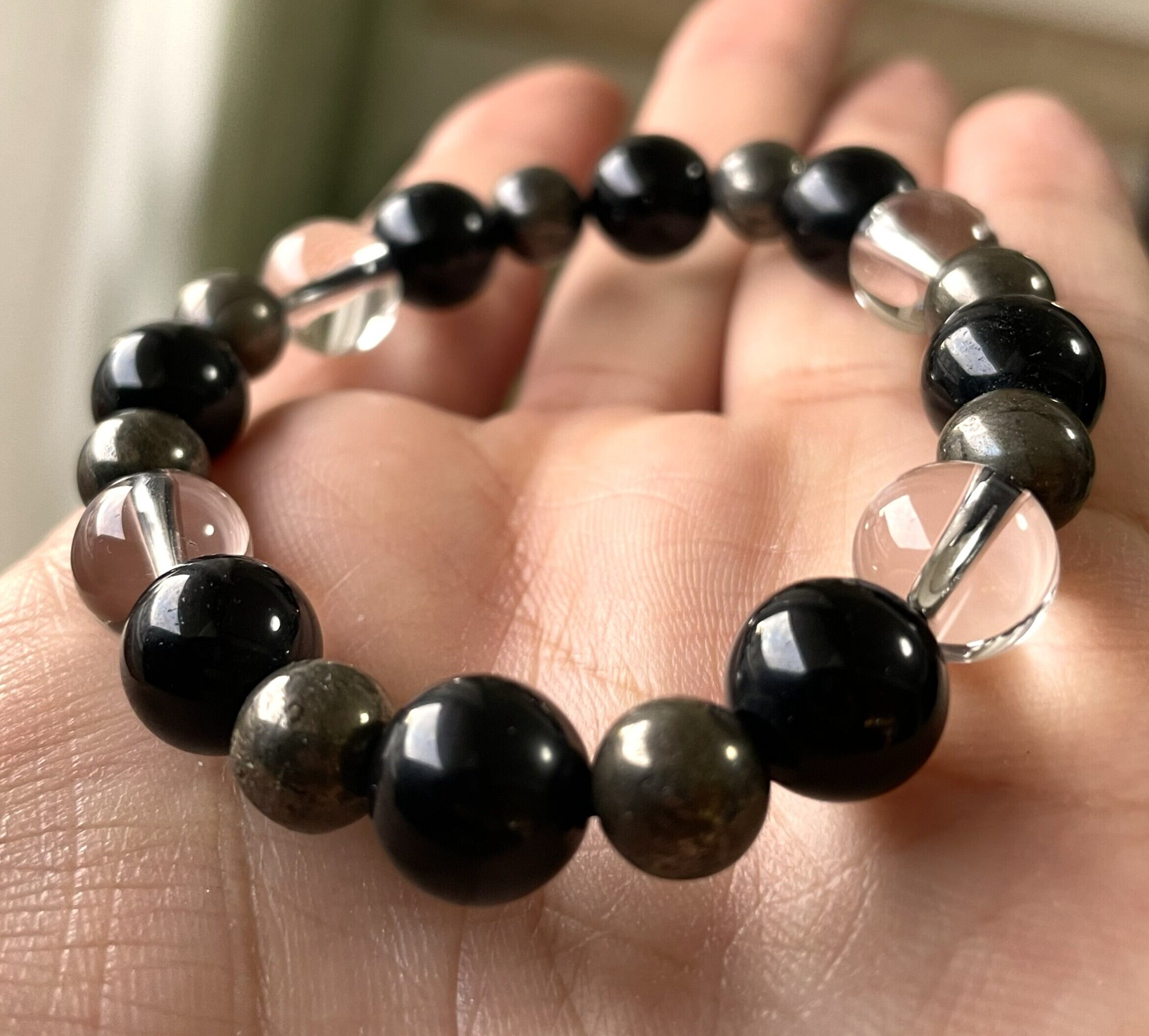 高品質クリア水晶&モリオン(黒水晶)&パイライト(黄鉄鉱)の強い石たちを構成し制作したブレスレットです。