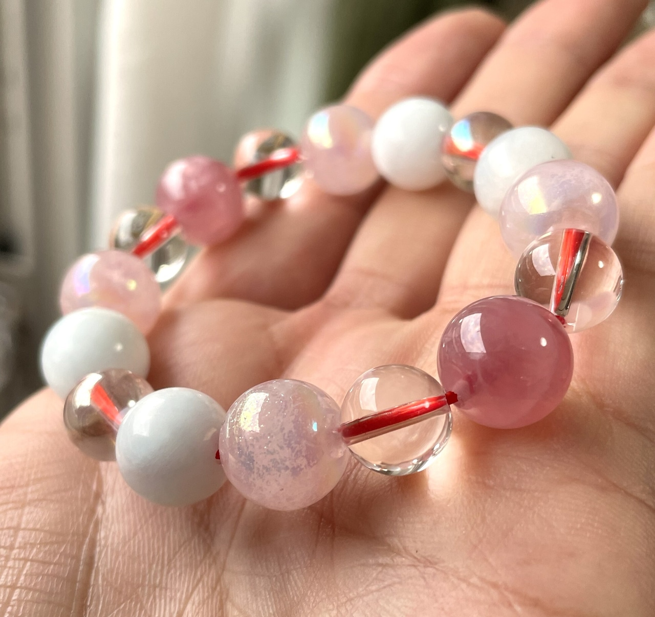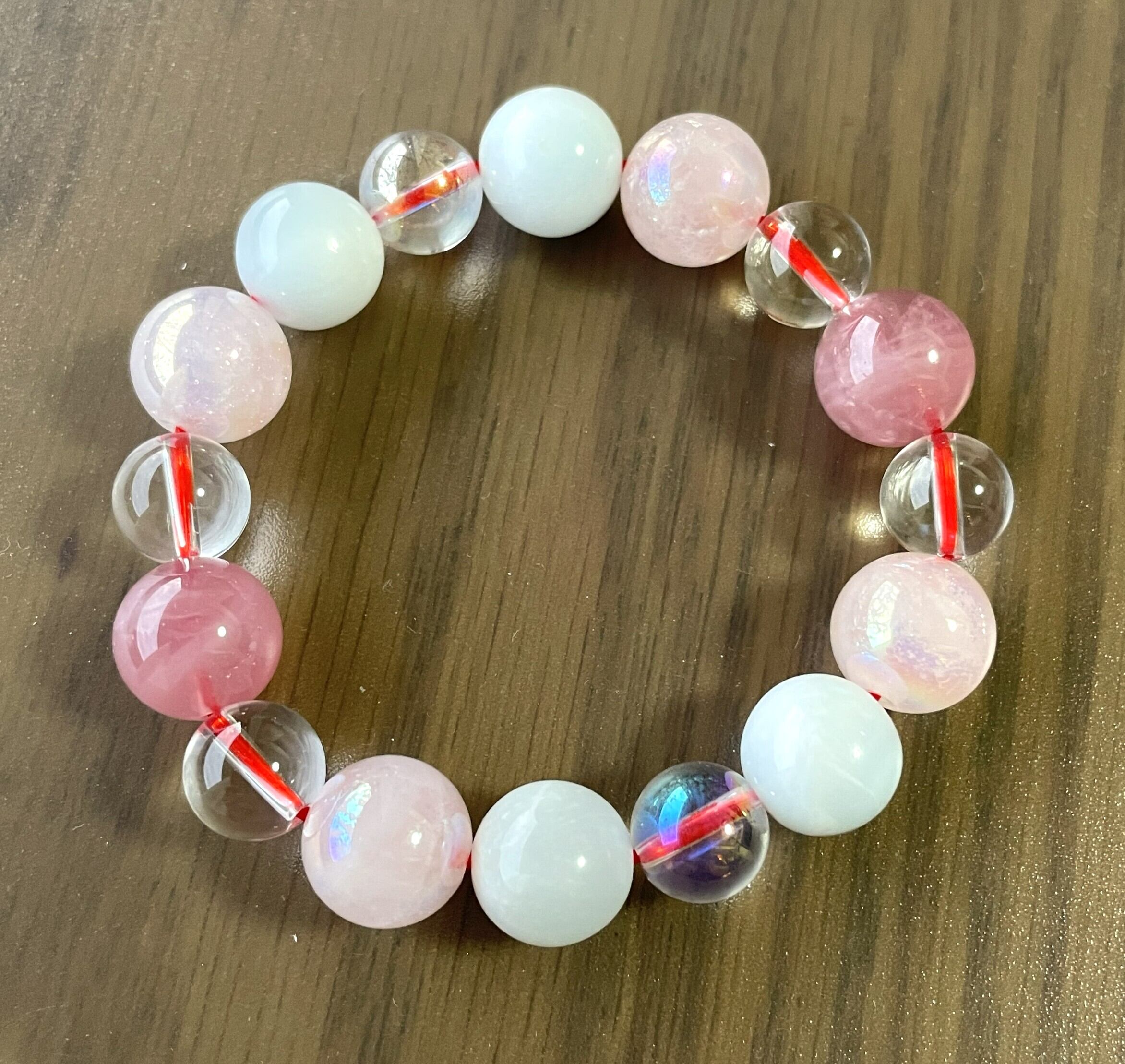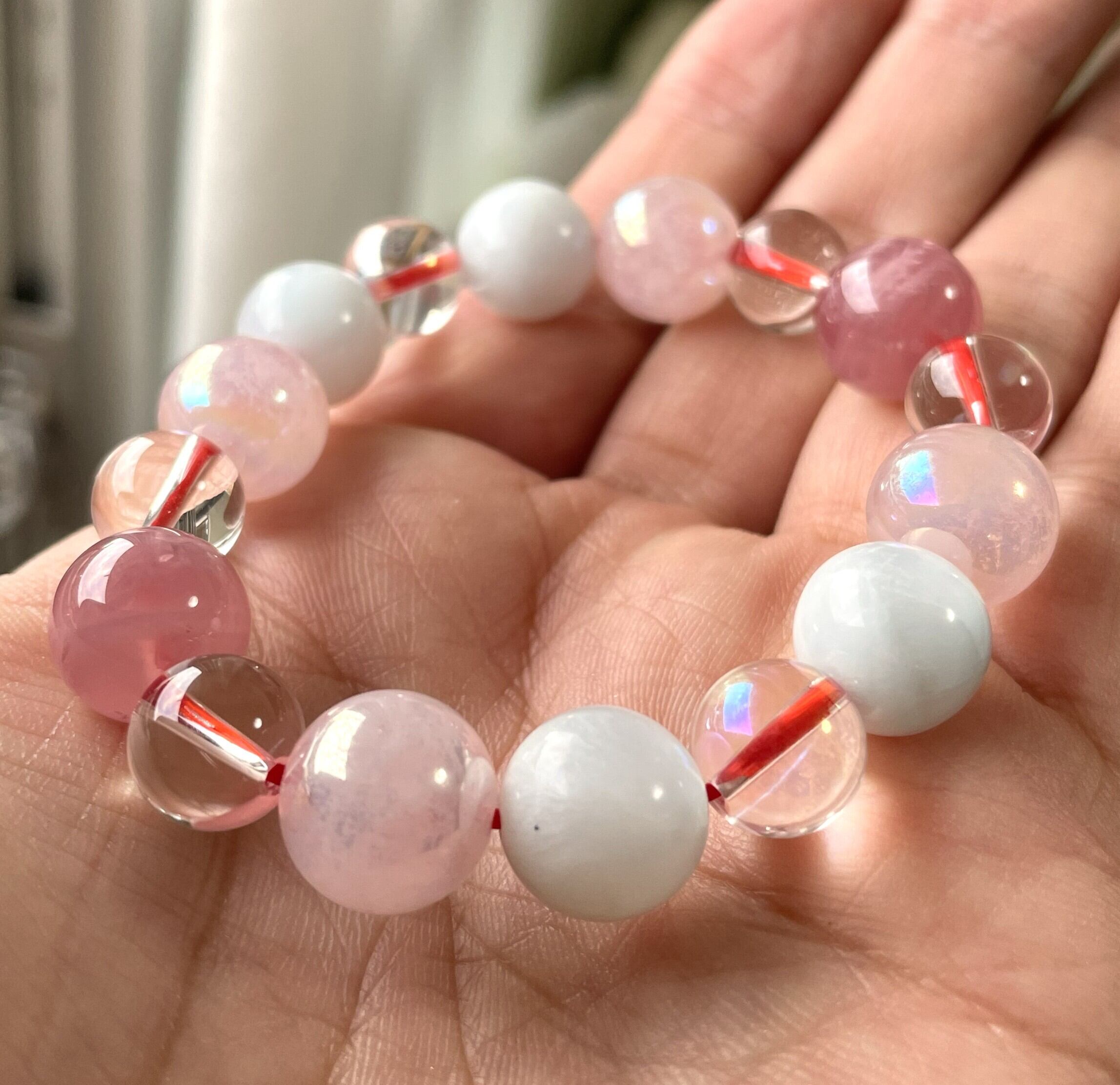 高品質アイスラリマー、マダガスカル産ローズクォーツ、エンジェルオーラ ローズクォーツ、エンジェルオーラ水晶、高品質クリア水晶を組み合わせた独創的で美しいブレスレットです。