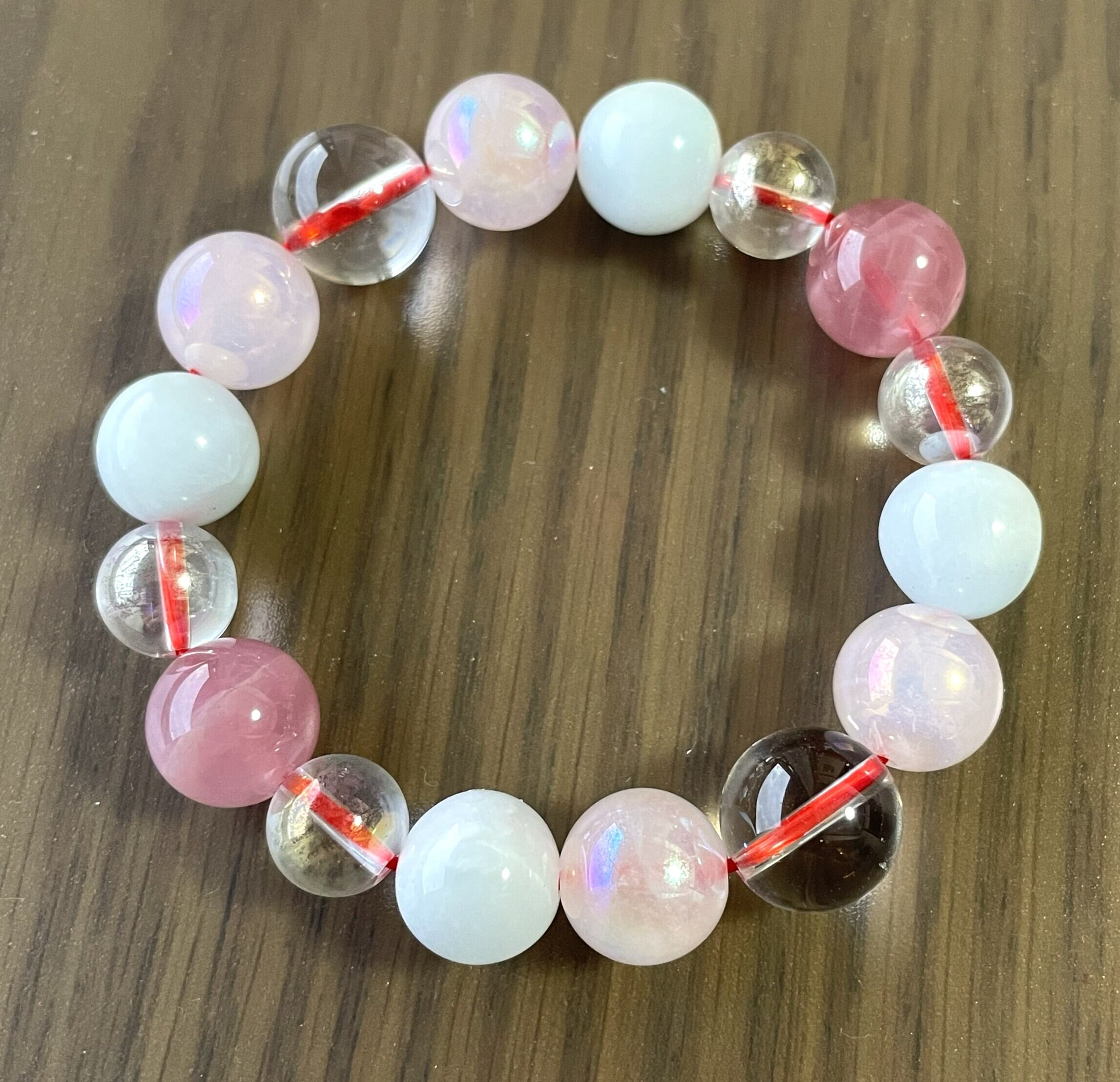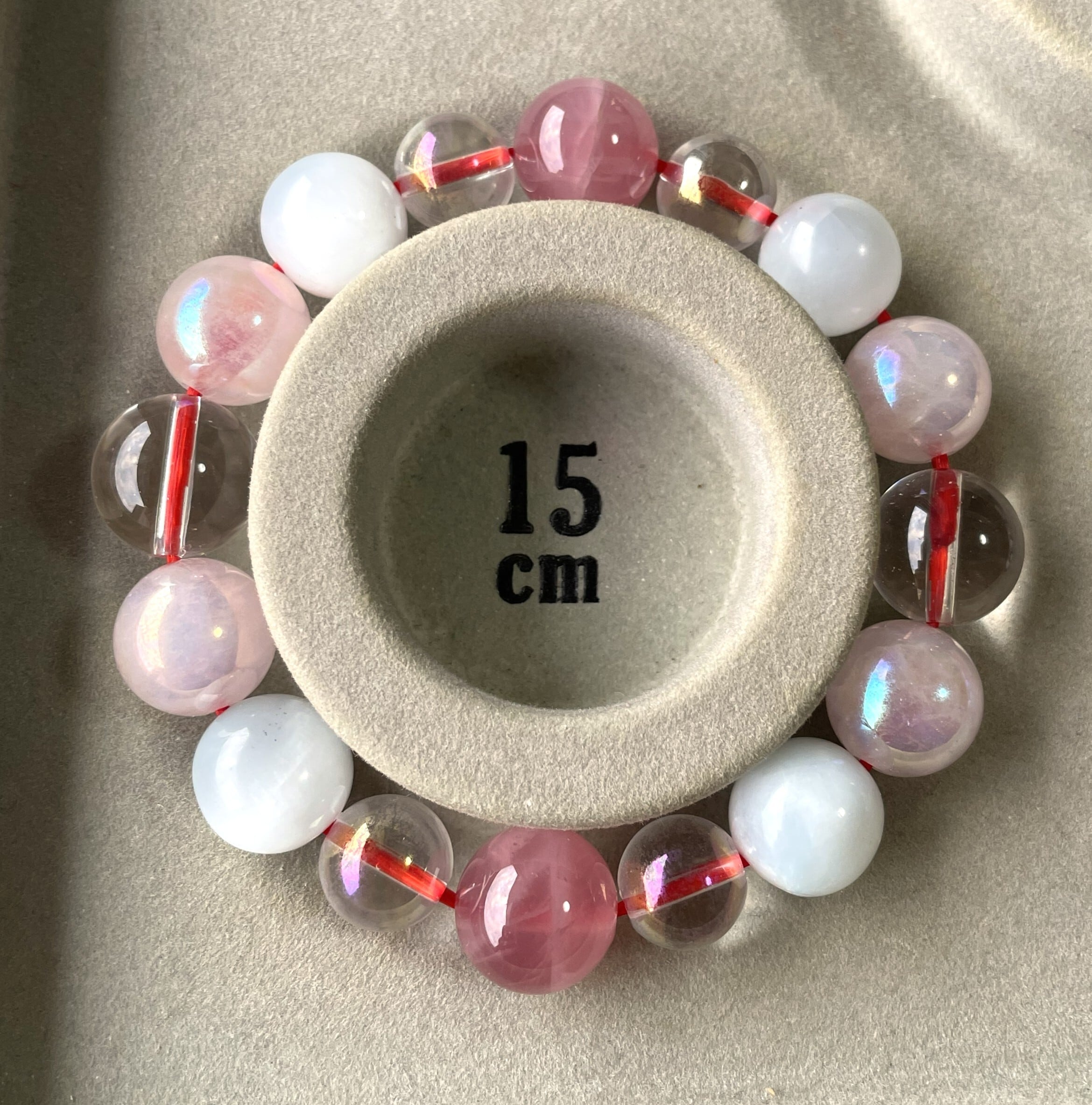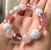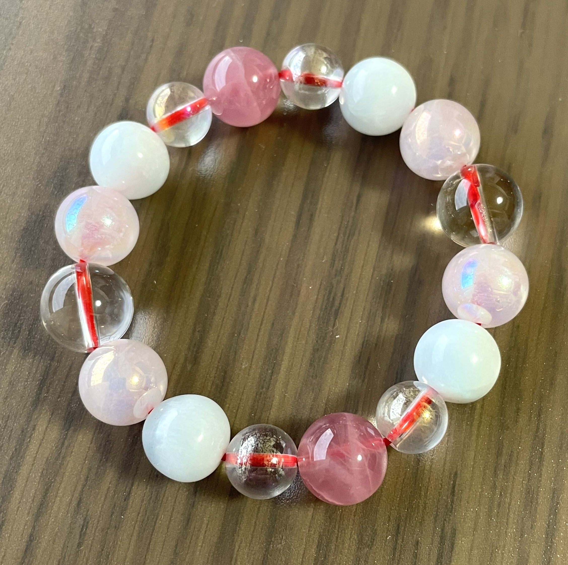 高品質アイスラリマー、マダガスカル産ローズクォーツ、エンジェルオーラ ローズクォーツ、エンジェルオーラ水晶、高品質クリア水晶を組み合わせた独創的で美しいブレスレットです。