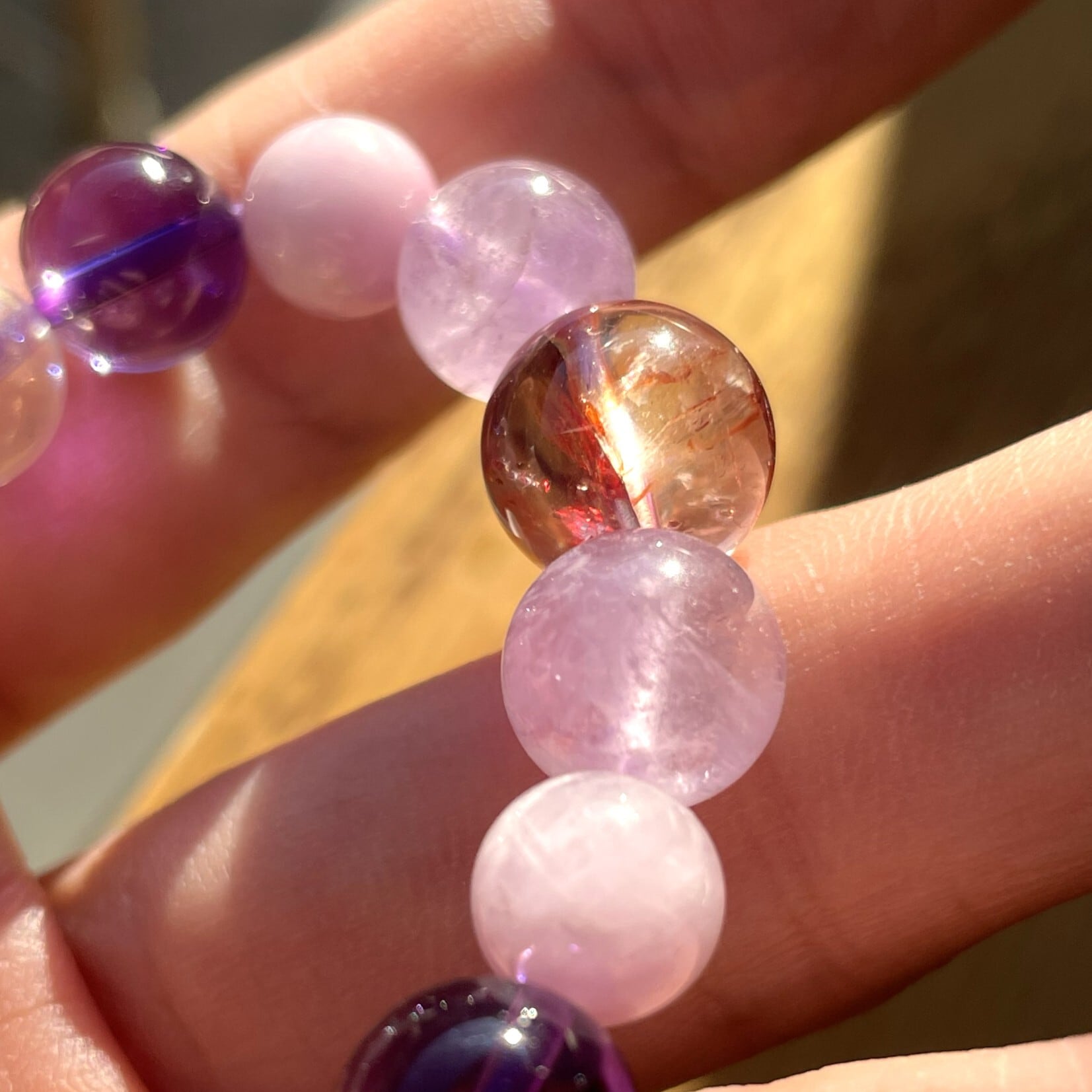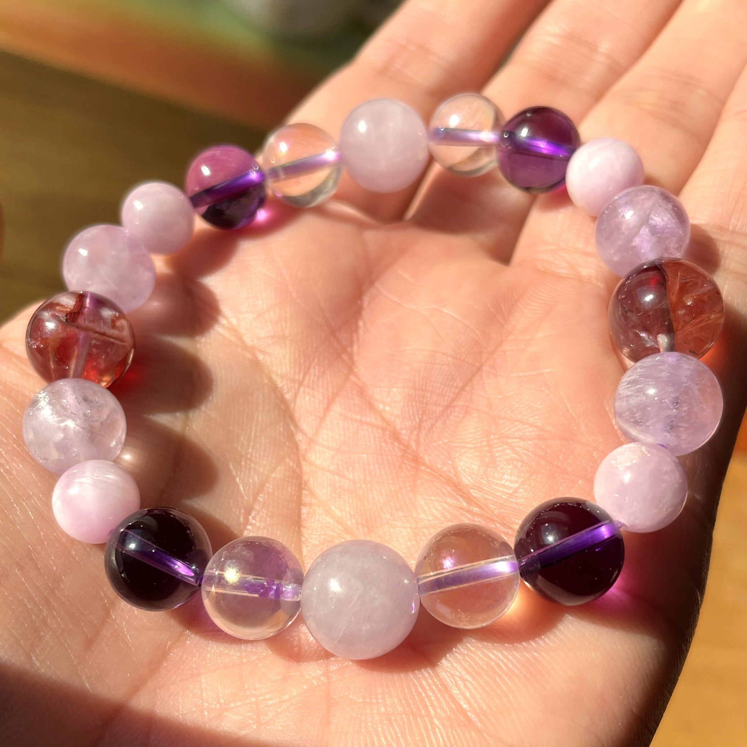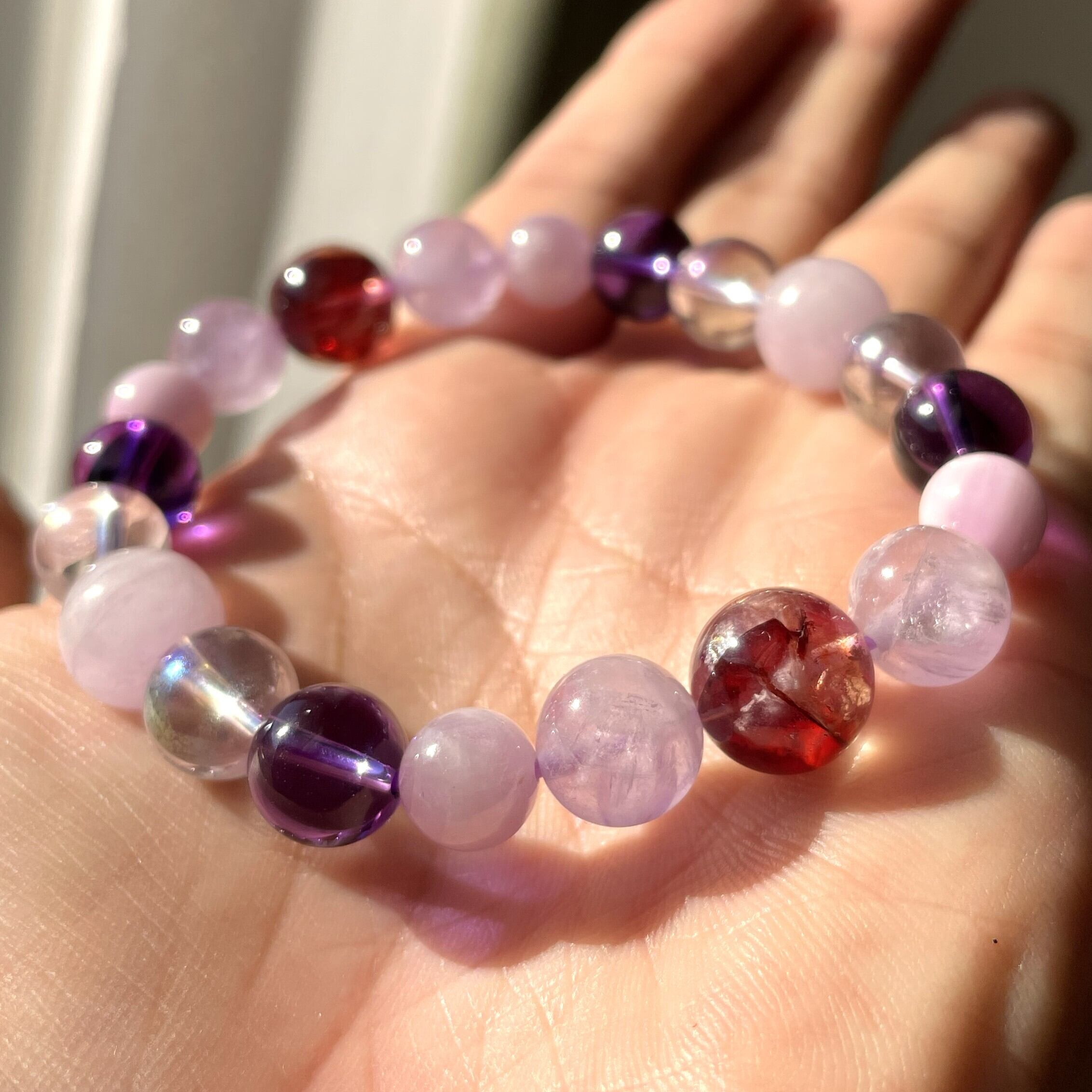 高品質アメジスト、高品質レッドライモナイト水晶、クンツァイト、ラベンダーアメジスト、オーラ水晶を組み合わせた高貴な紫色彩の美しいブレスレットです。