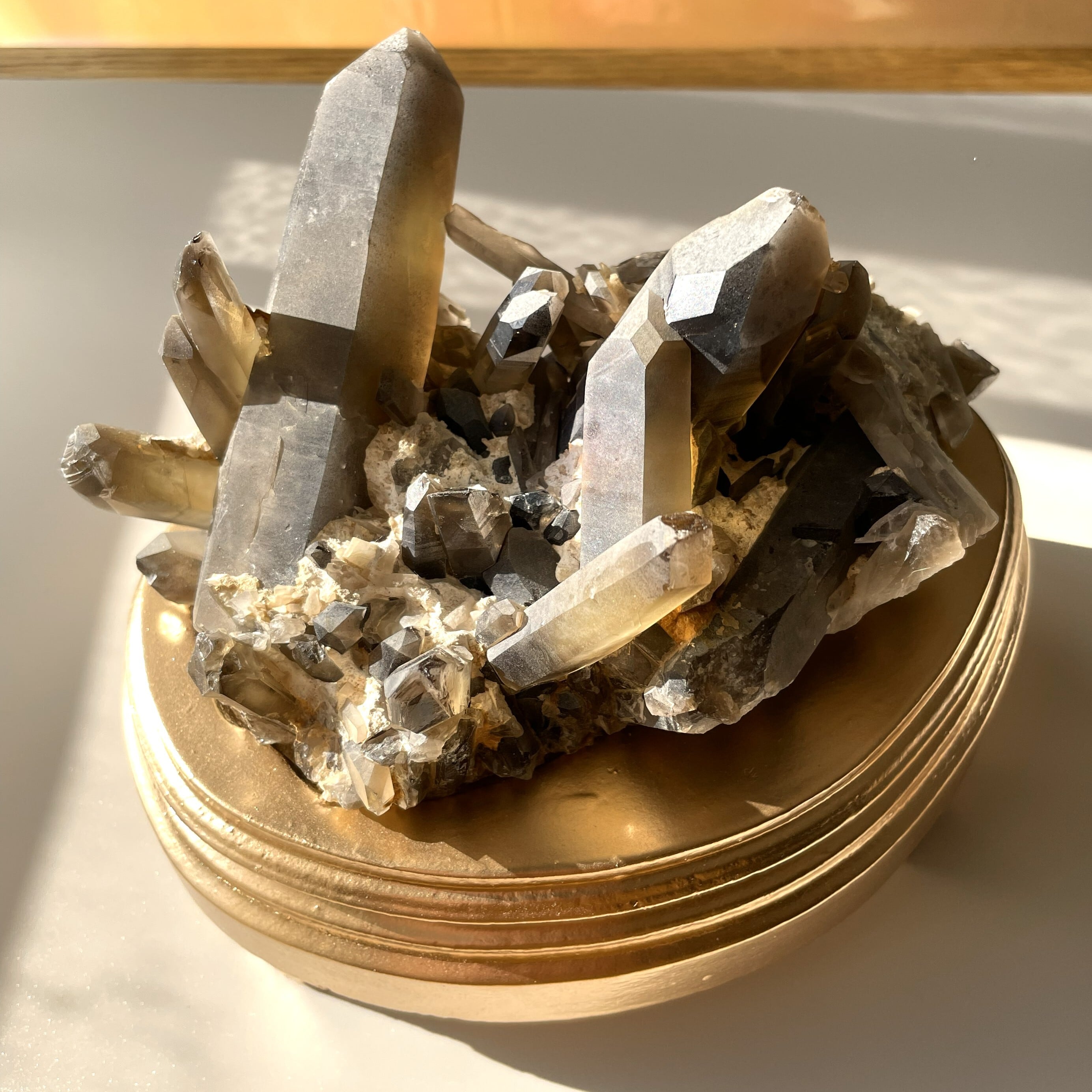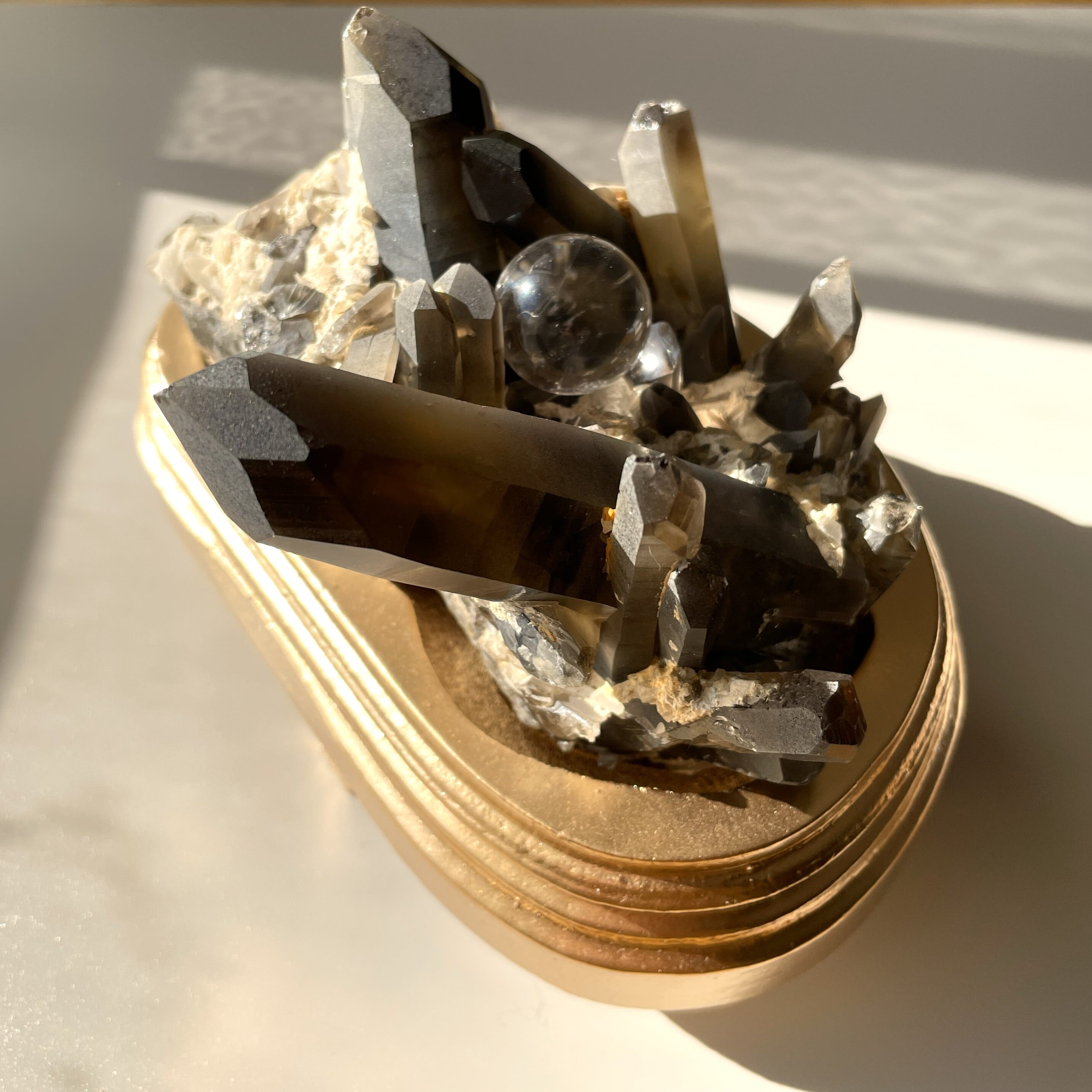 このスモーキークォーツクラスターとしっくりくるためクリアな丸玉水晶もお付けします。画像の位置が定位置でバランスがとれます。一緒にずっとメンテナンスしてきました。