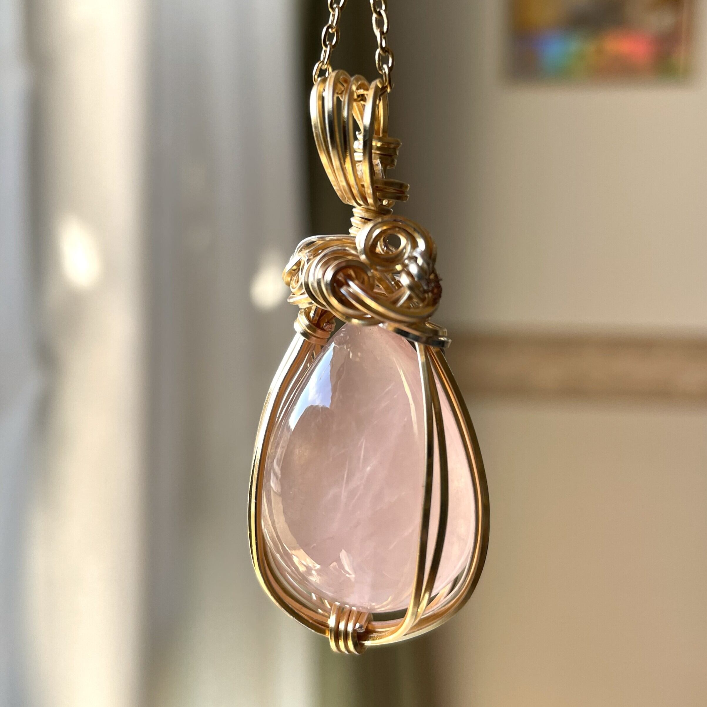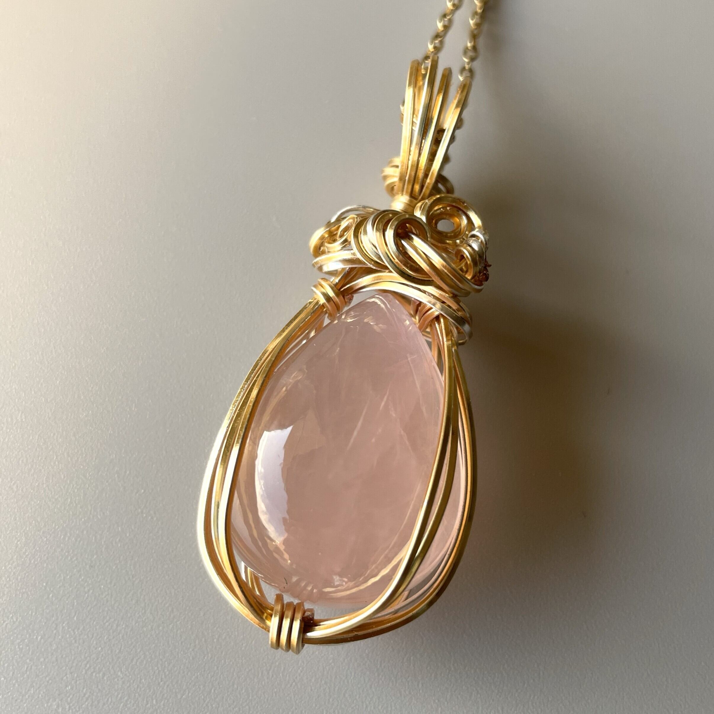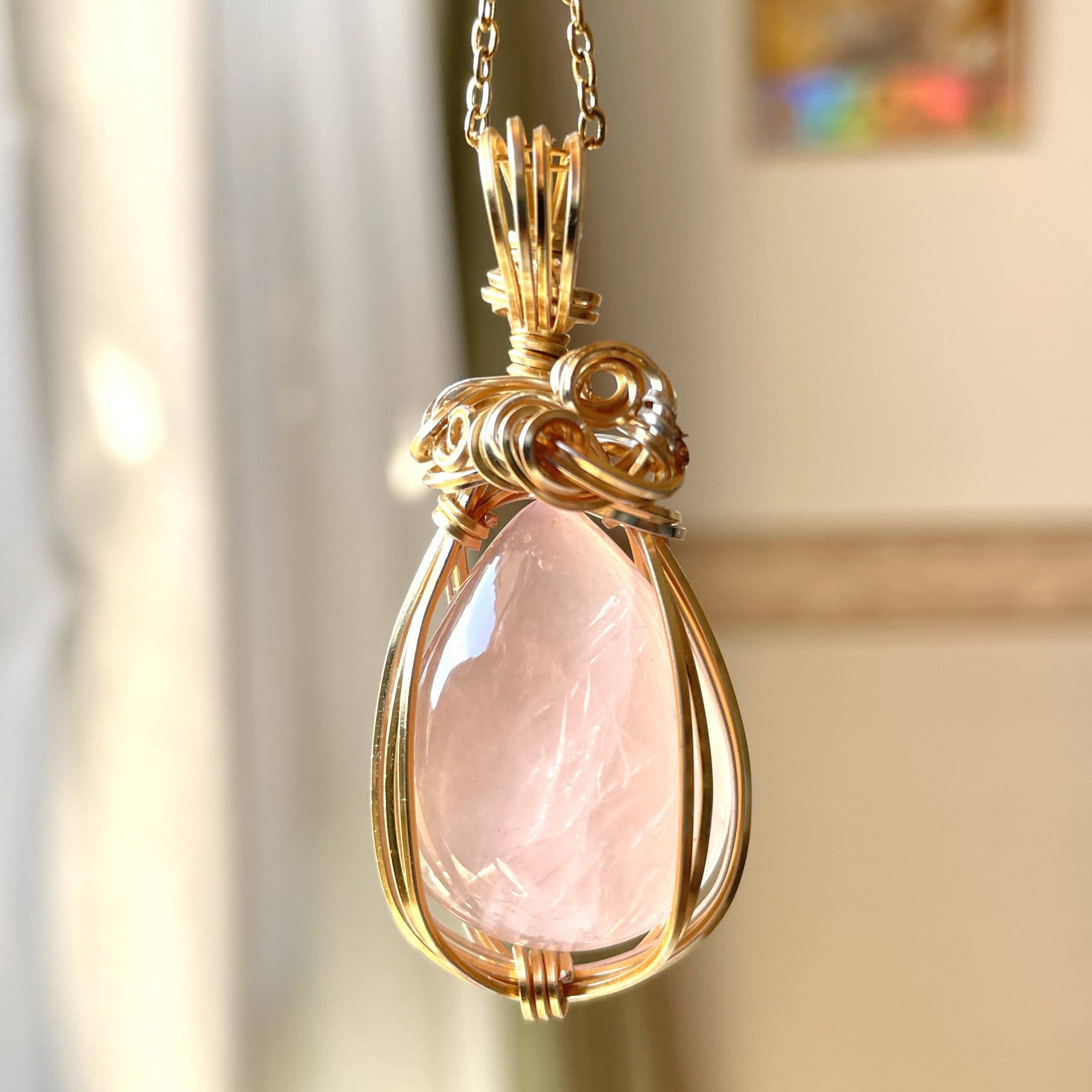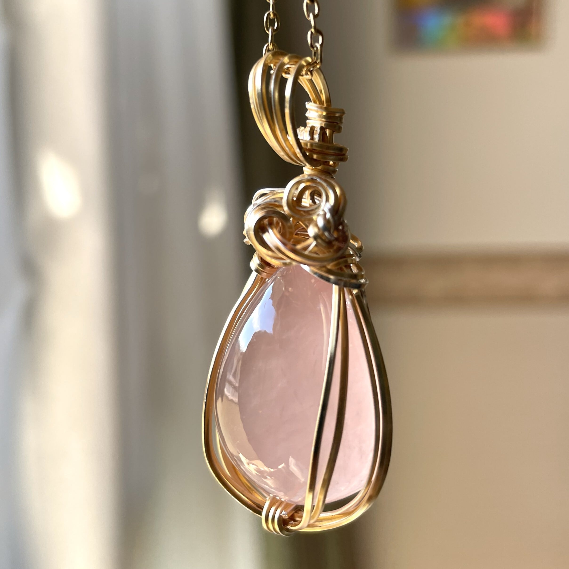 美しいローズクォーツ(紅水晶)をゴールド&シルバーのワイヤーにて魅力的なペンダントに仕立てました。たくさんの光が入り、より輝くように意図し創造しています。