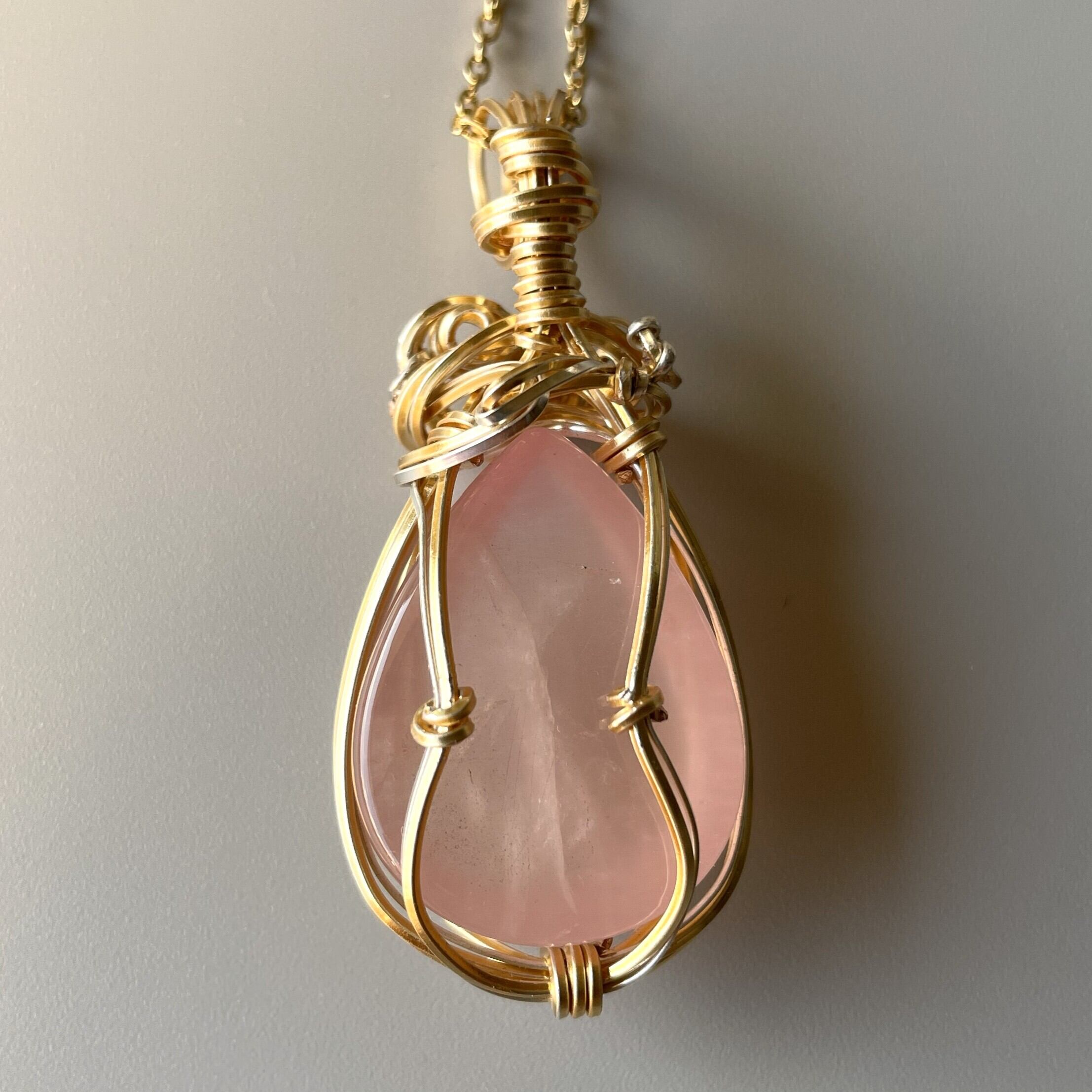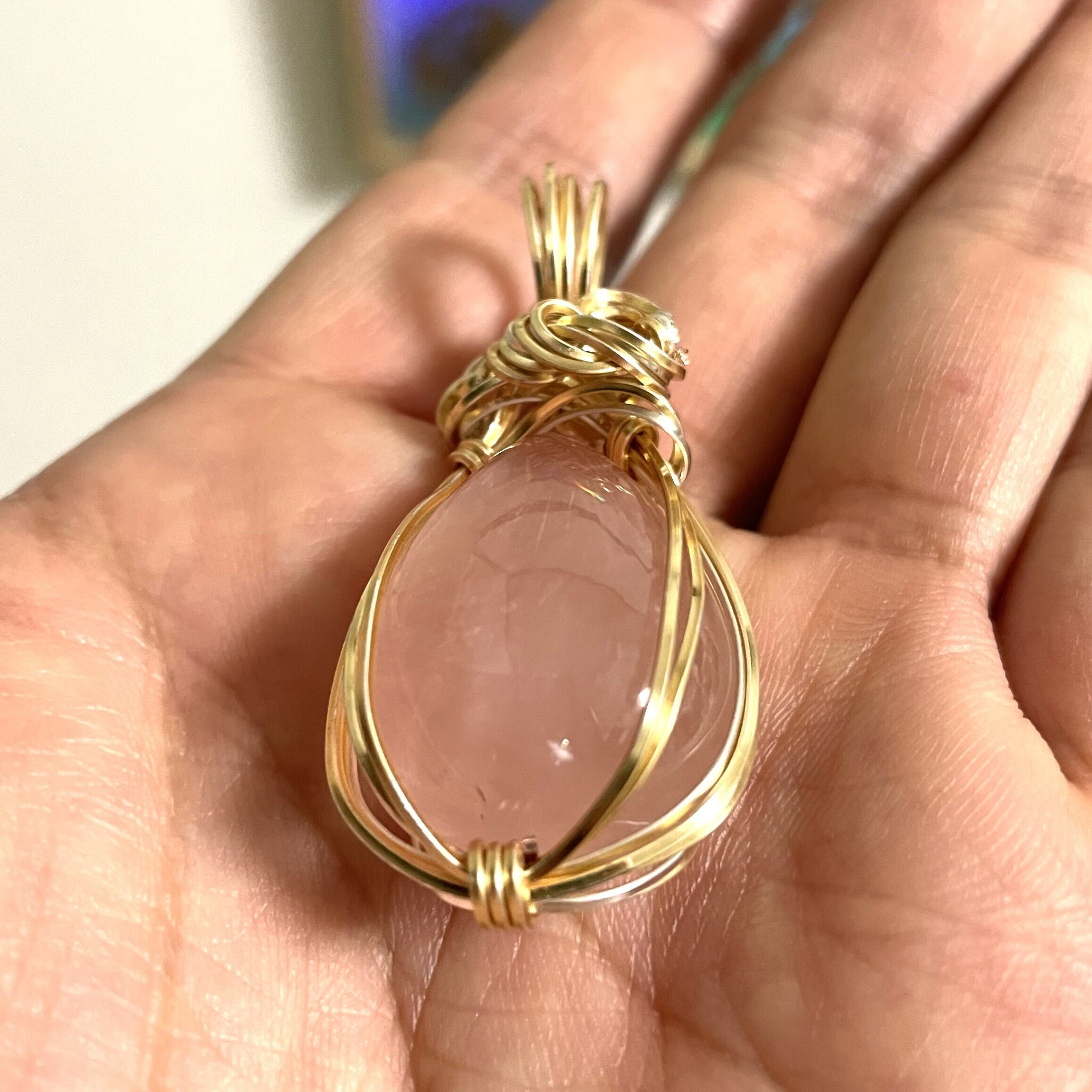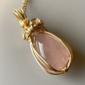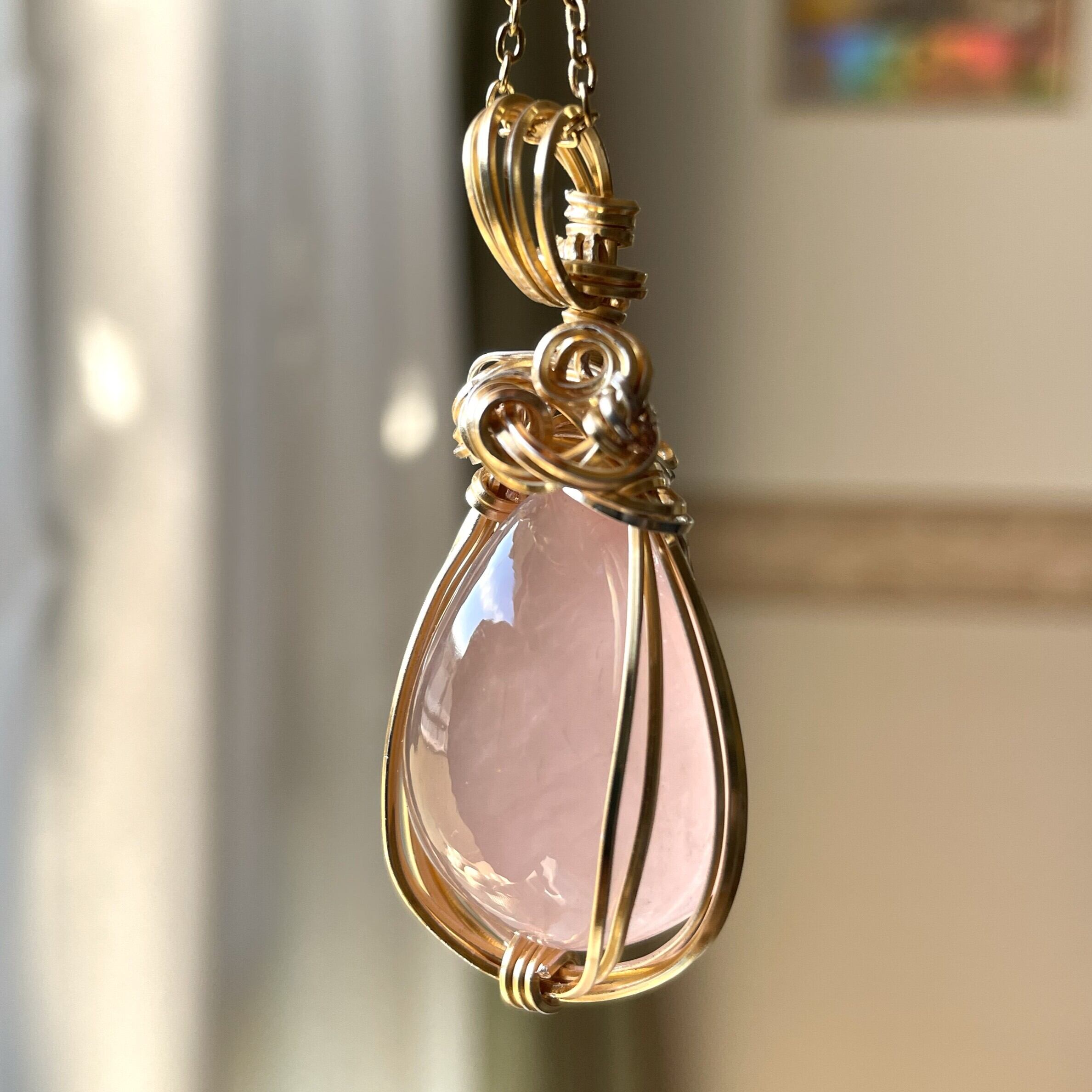 美しいローズクォーツ(紅水晶)をゴールド&シルバーのワイヤーにて魅力的なペンダントに仕立てました。たくさんの光が入り、より輝くように意図し創造しています。