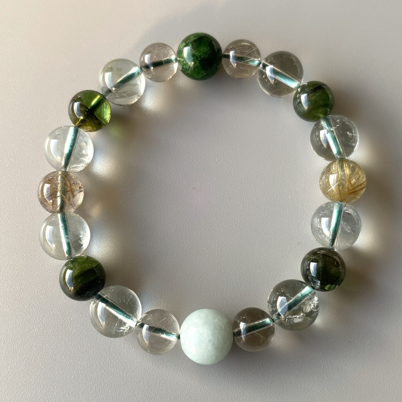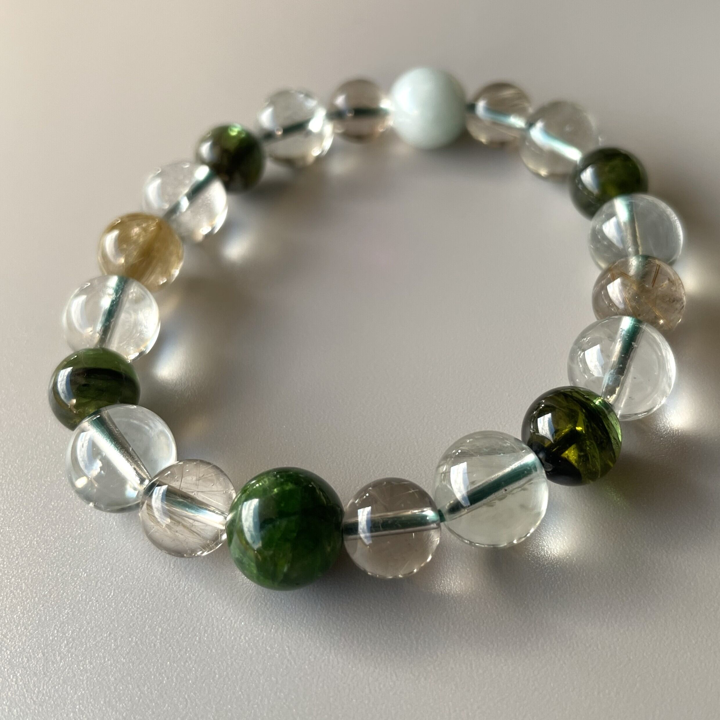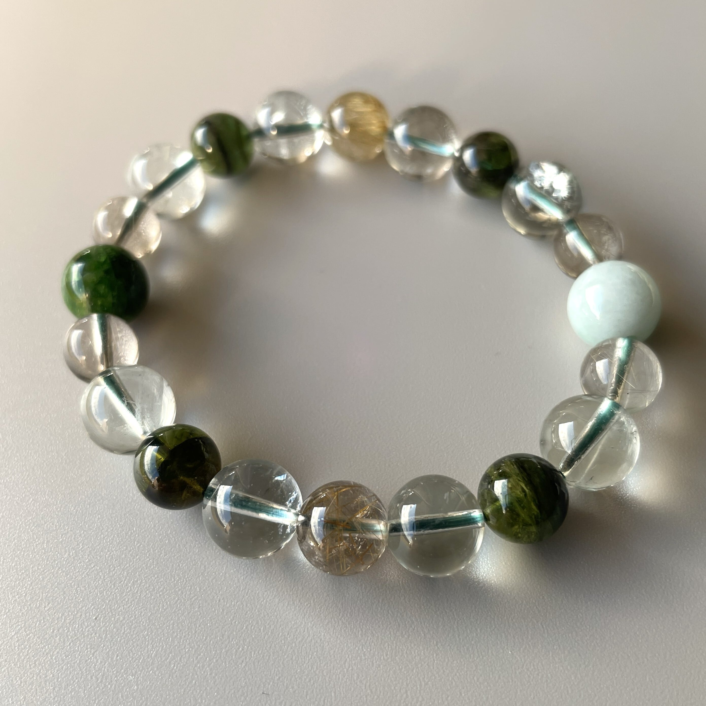 美しく豊かな緑の色彩の石たちで創造した グリーンライトブレスレットです。