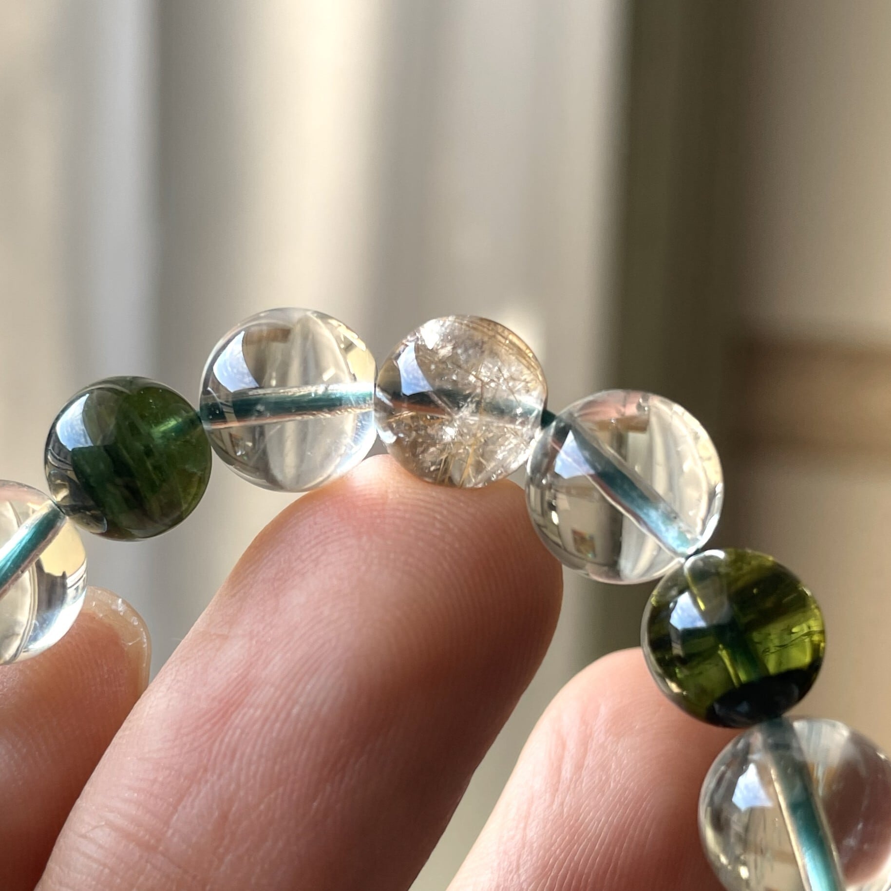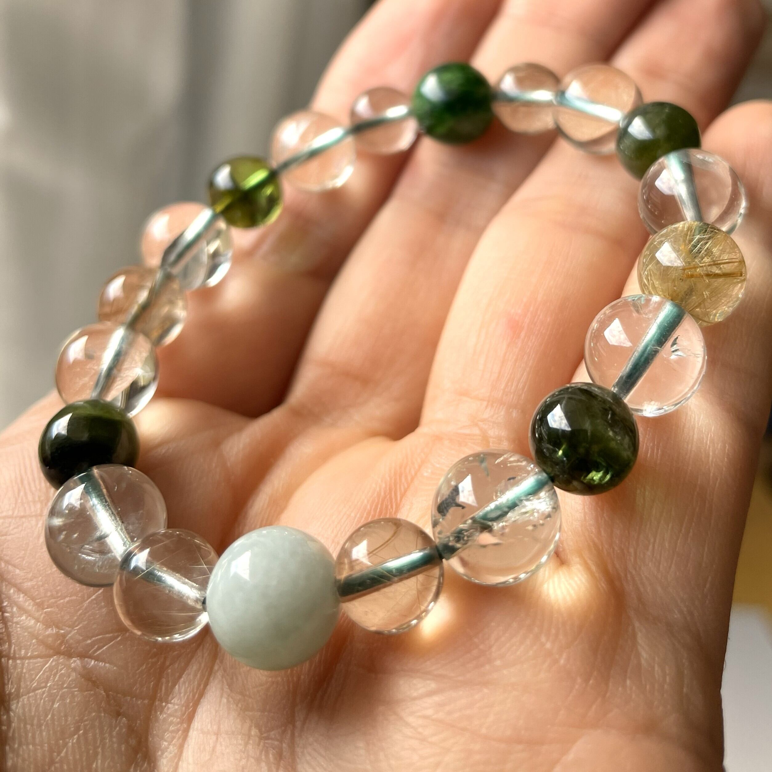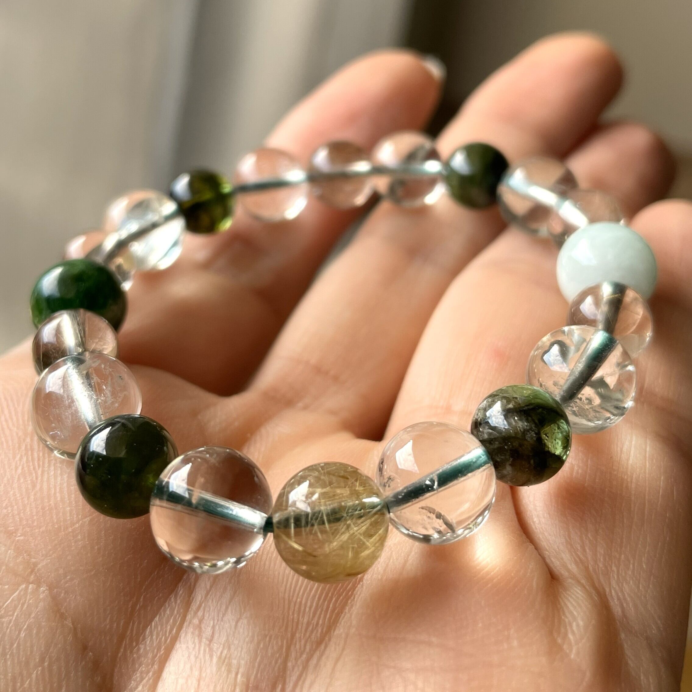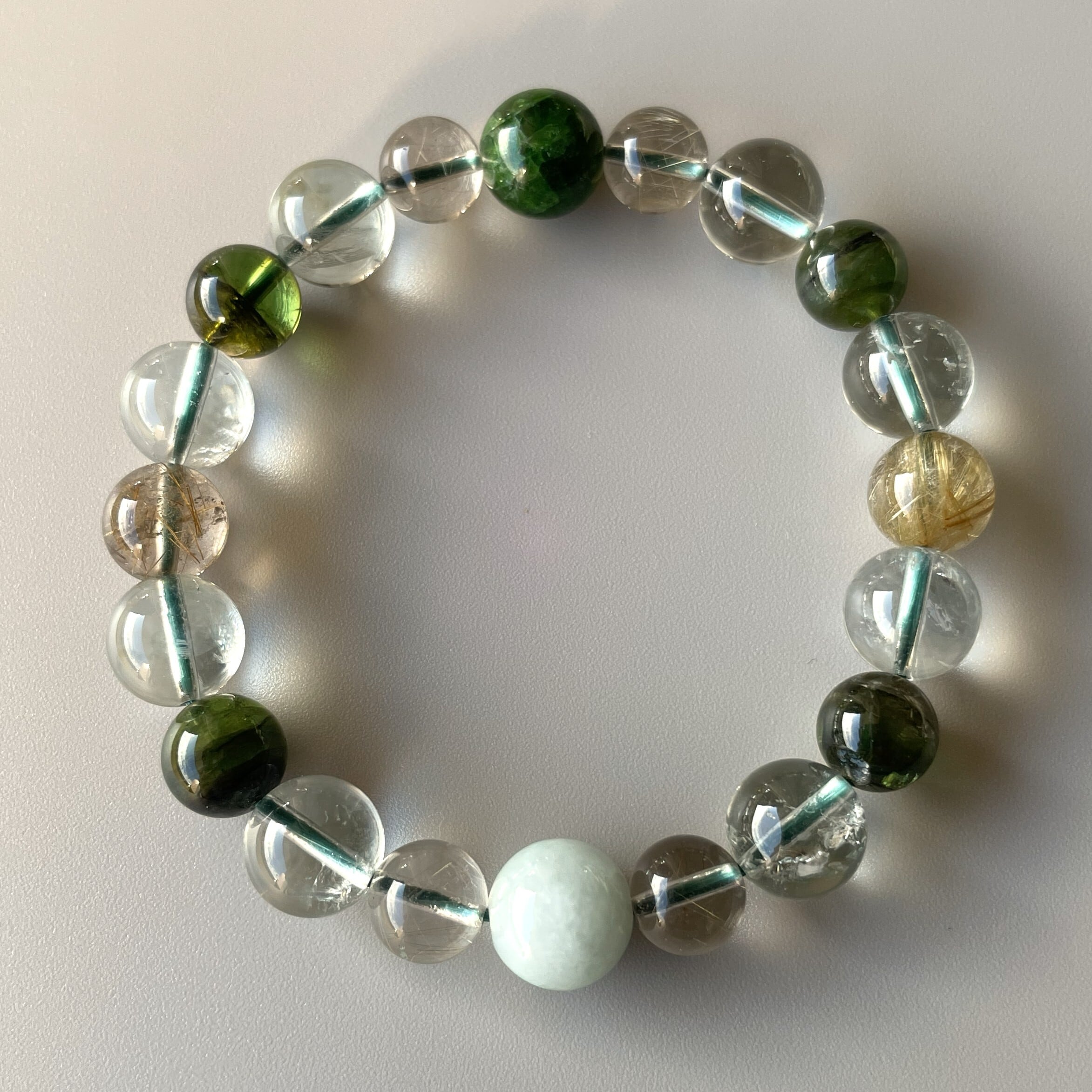 ゴールドルチルの1石は、ルチルがたくさん入った高品質。 グリーントルマリンは光が入ると深い森を感じられる神秘的なグリーンカラー。 1本だけのこだわりブレスレットです。