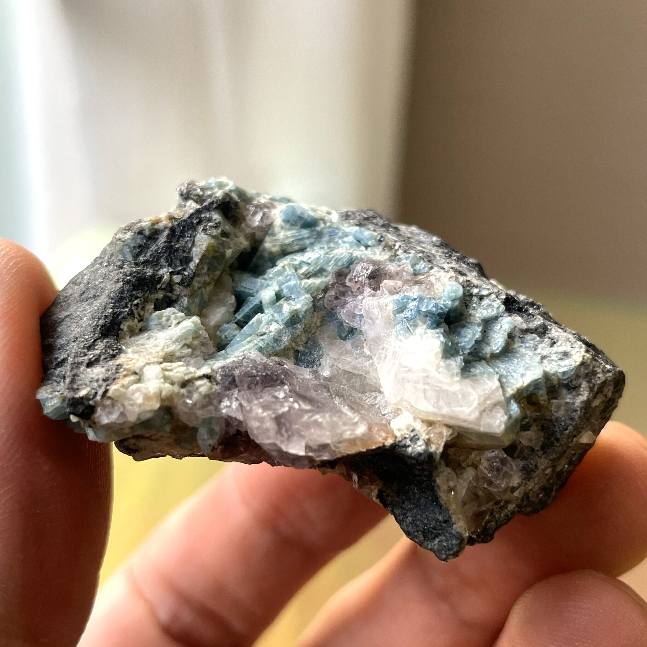 希少なフェナカイトとフローライトとアクアマリンが共生しているクラスターです。(ロシア産)1枚目画像だとフェナカイトは中央右の白い石です。