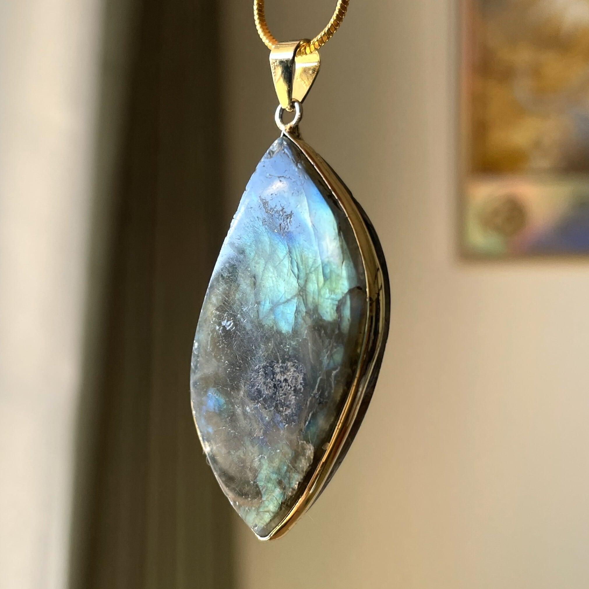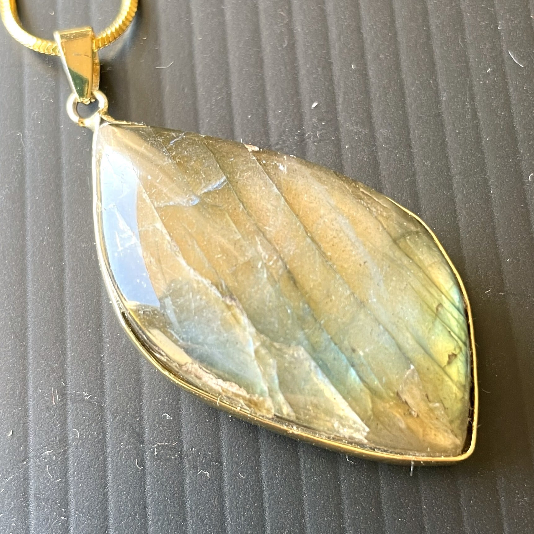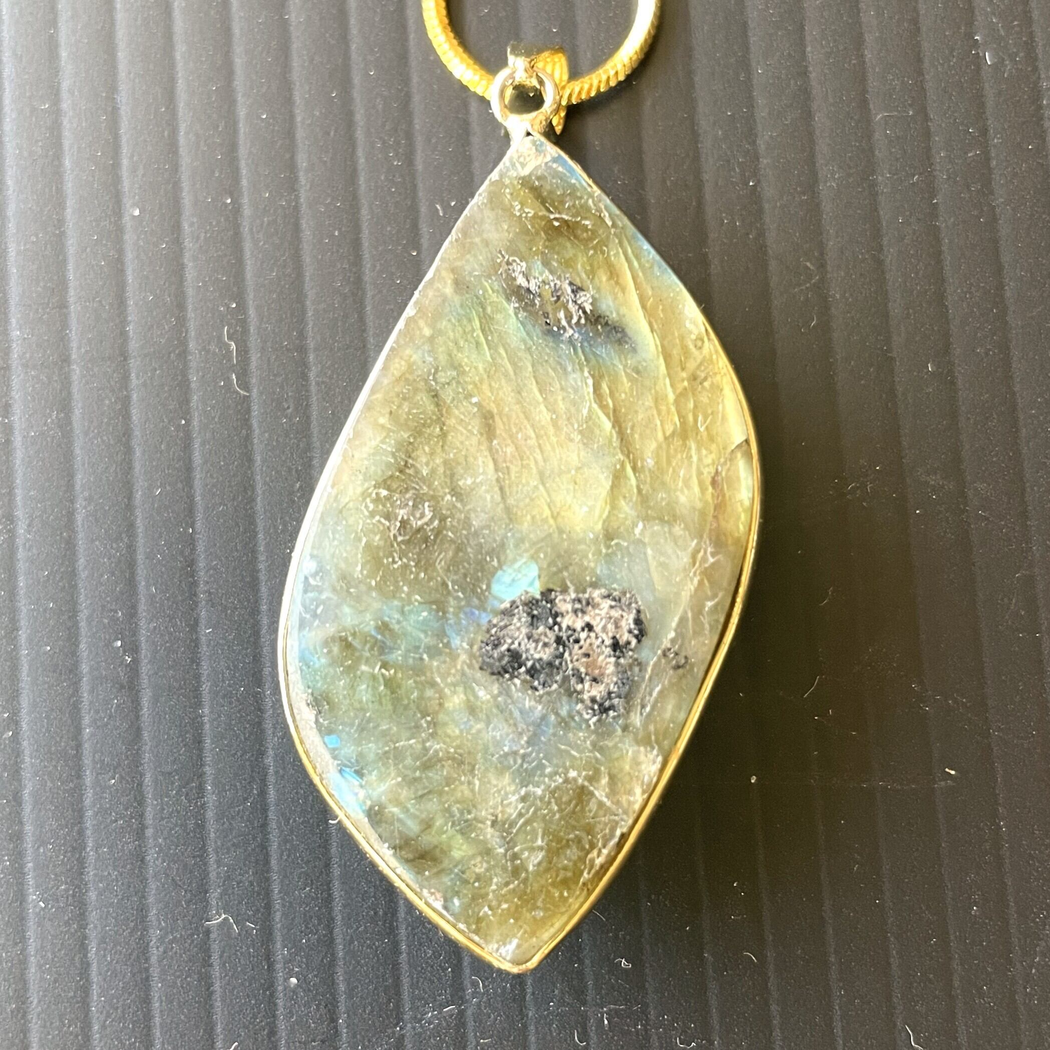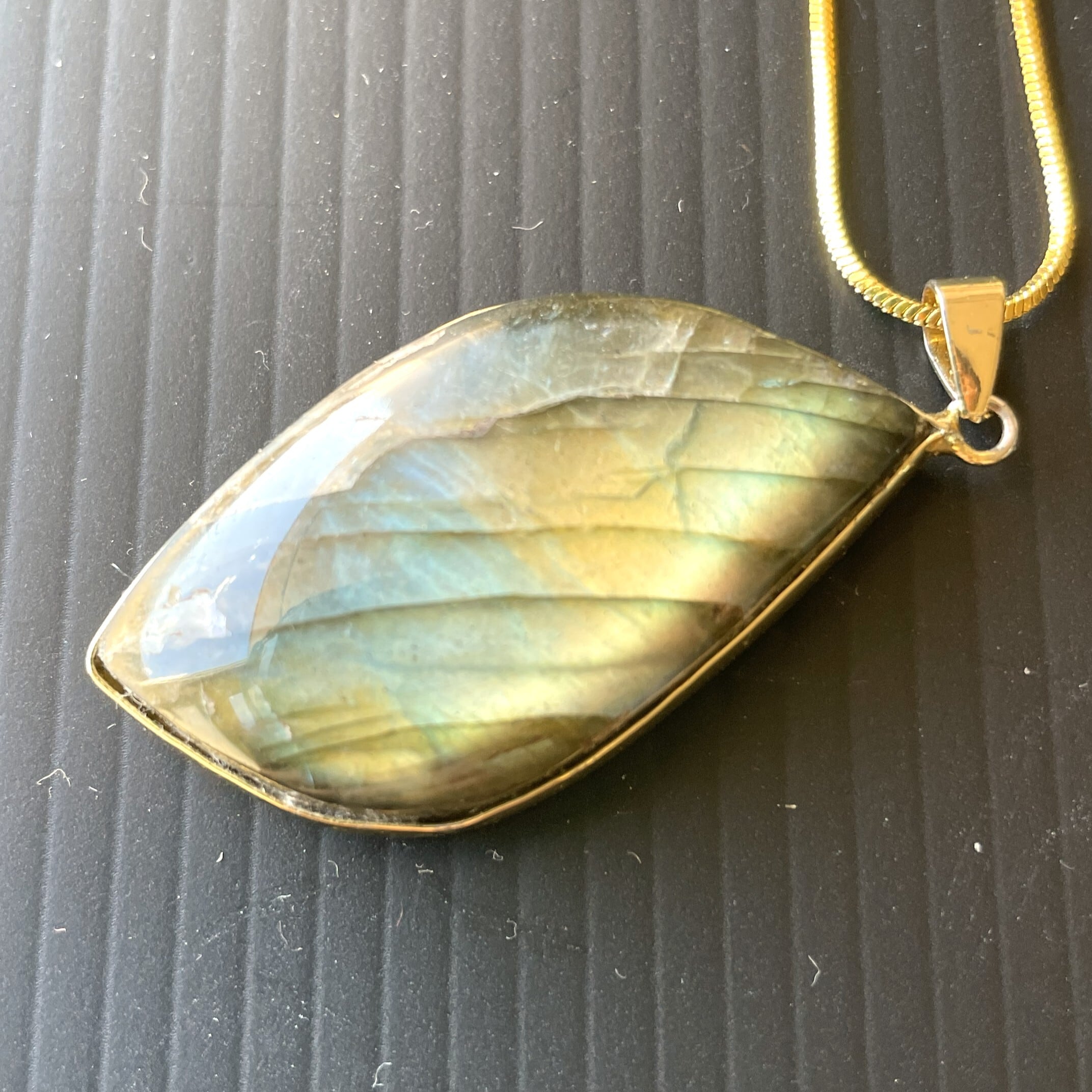 光の反射でゴールド、イエロー、ブルー系の色彩に輝くラブラドライトペンダントです。