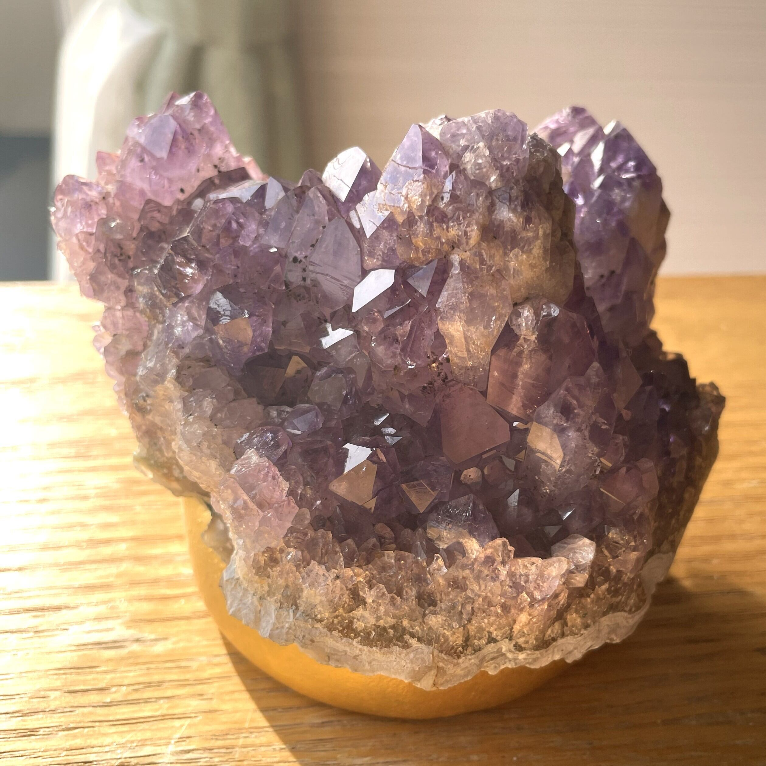 紫の山々が連なるような姿で、360度どの角度からも美しい姿を楽しめる素敵なアメジストクラスターです。