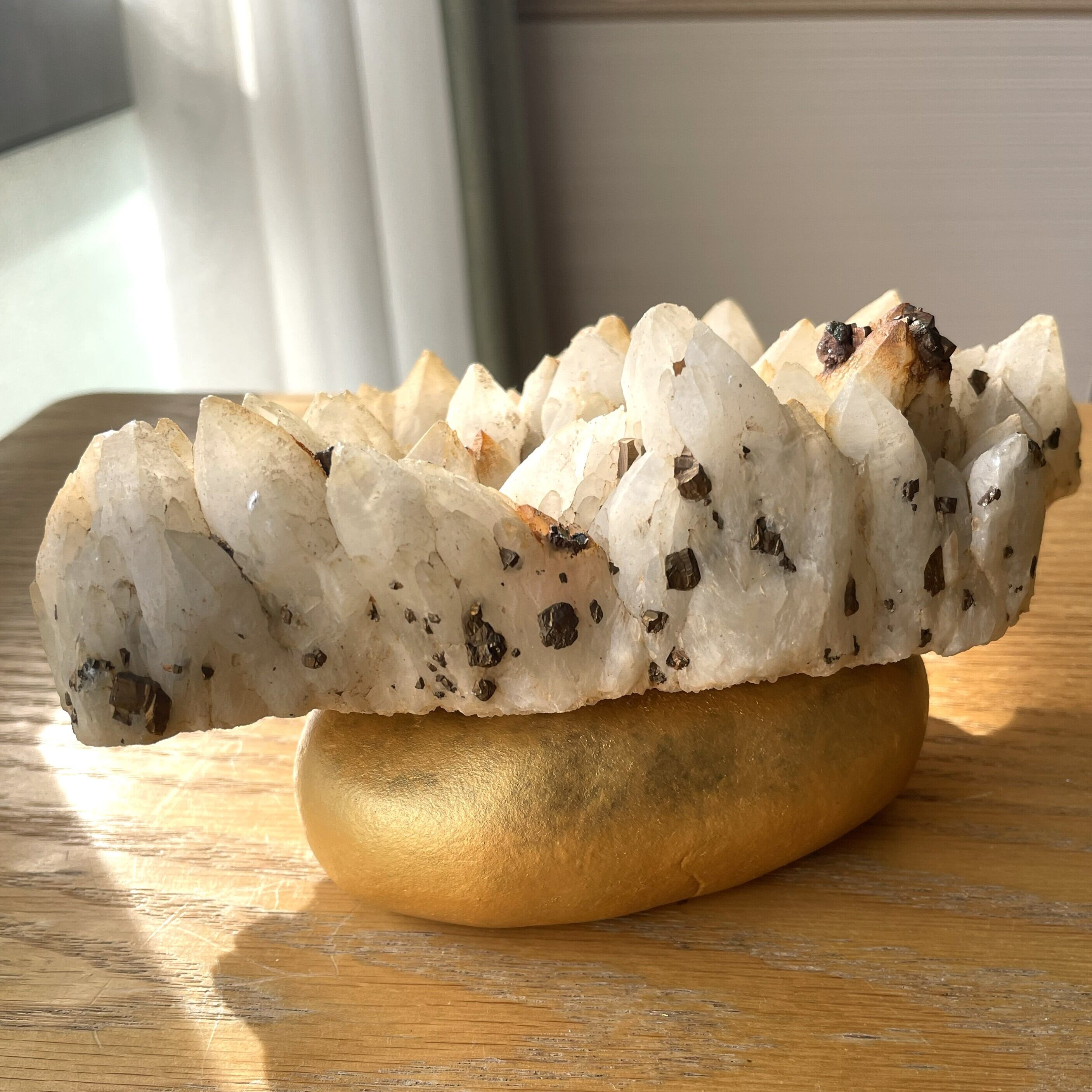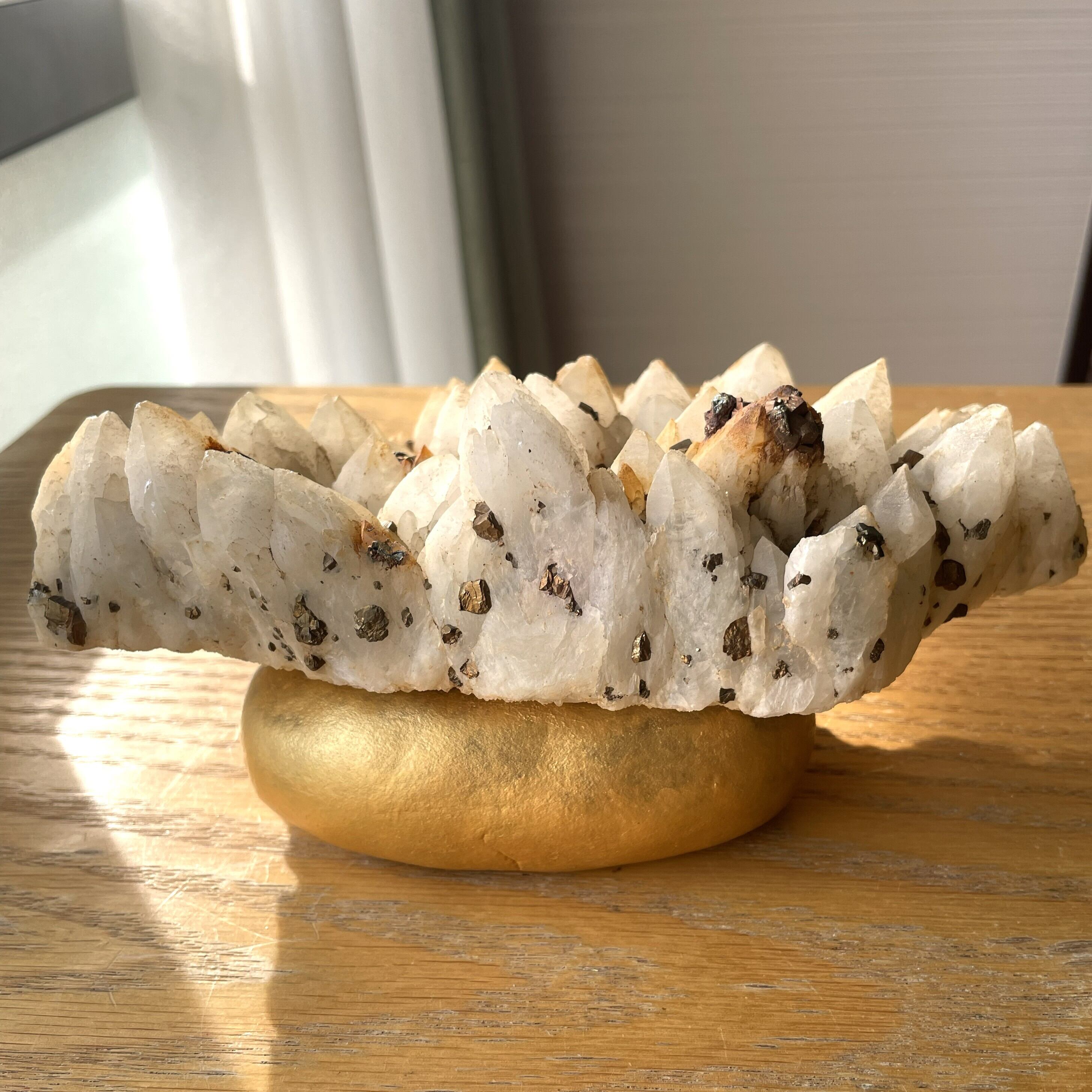 大きなサイズ 日本 国産水晶 パイライト共生クラスター 約1.5kg 天然石 自然石 専用台座付き ドラゴンスタークリスタル 送料無料