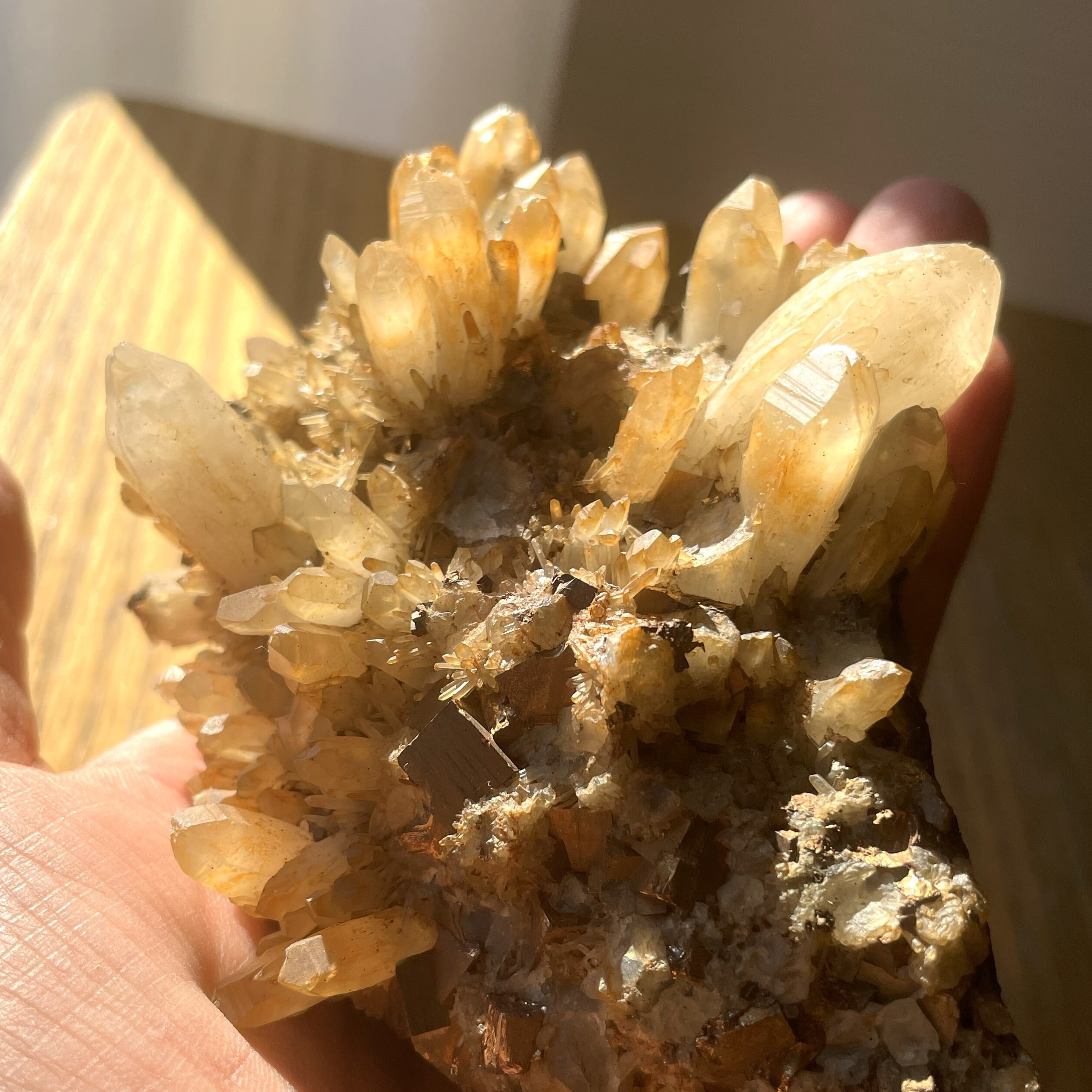 たくさんの大小の水晶とパイライト、チャルコパイライトが共生している魅力的な国産天然石です。