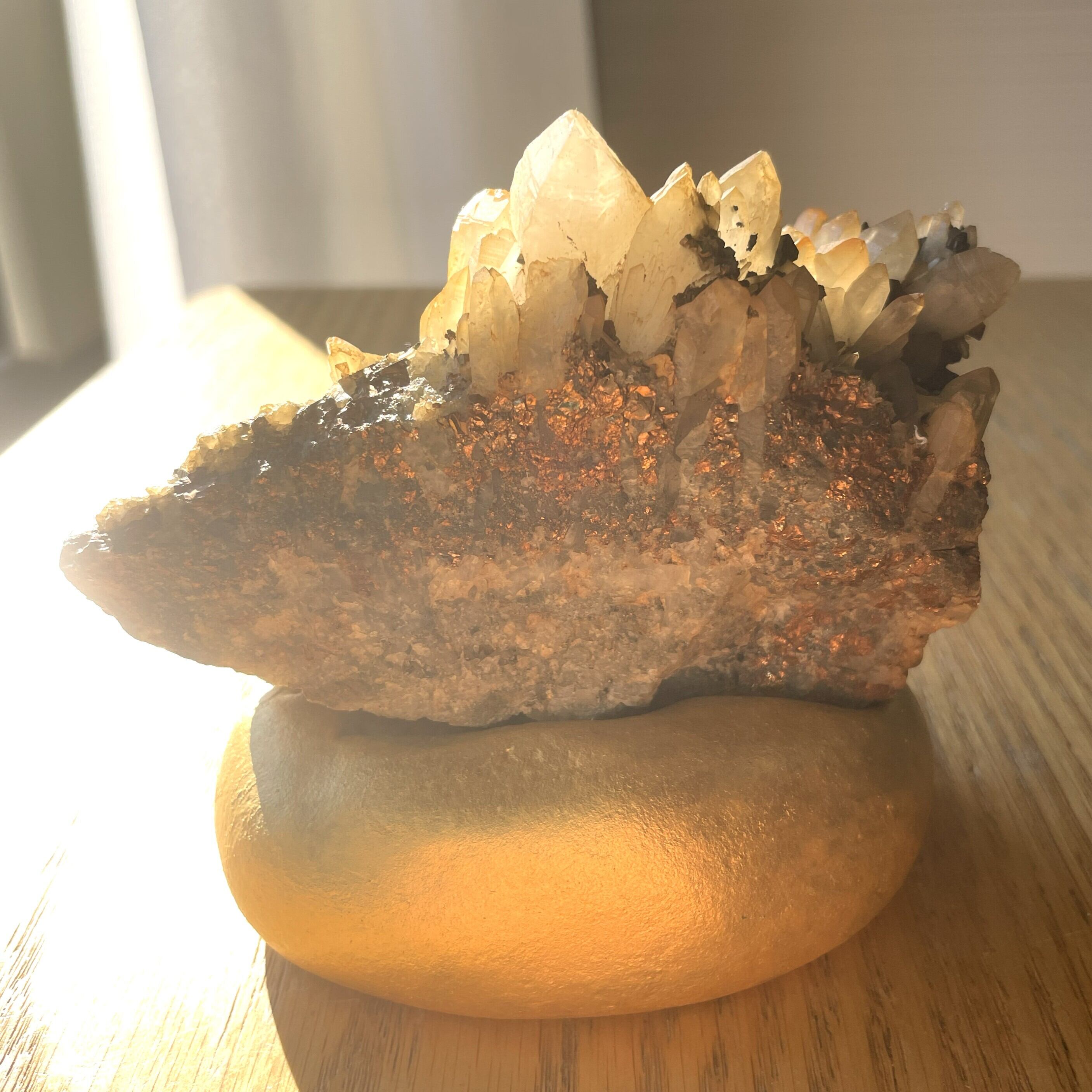 銅入り 日本 国産水晶 パイライト共生クラスター チャルコパイライト 天然石 原石 金運 成功 専用台座付き ドラゴンスタークリスタル 送料無料