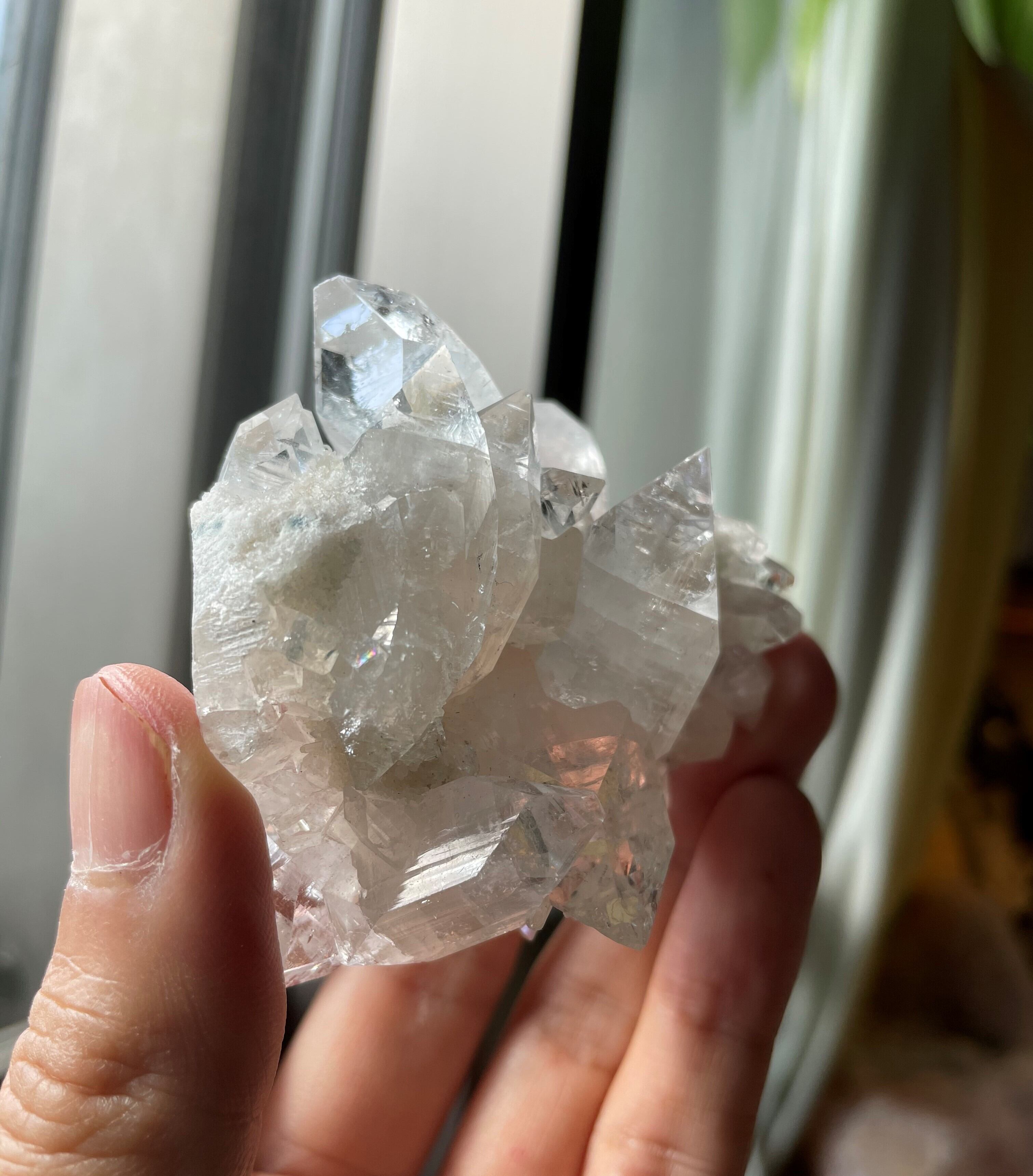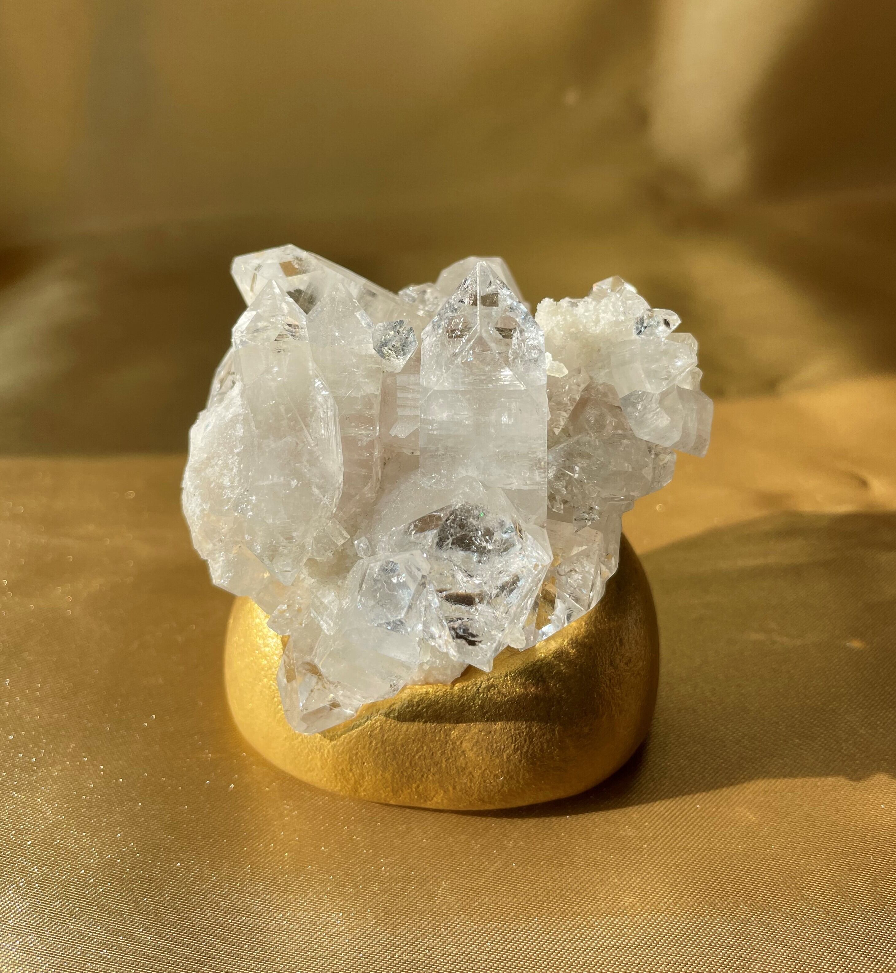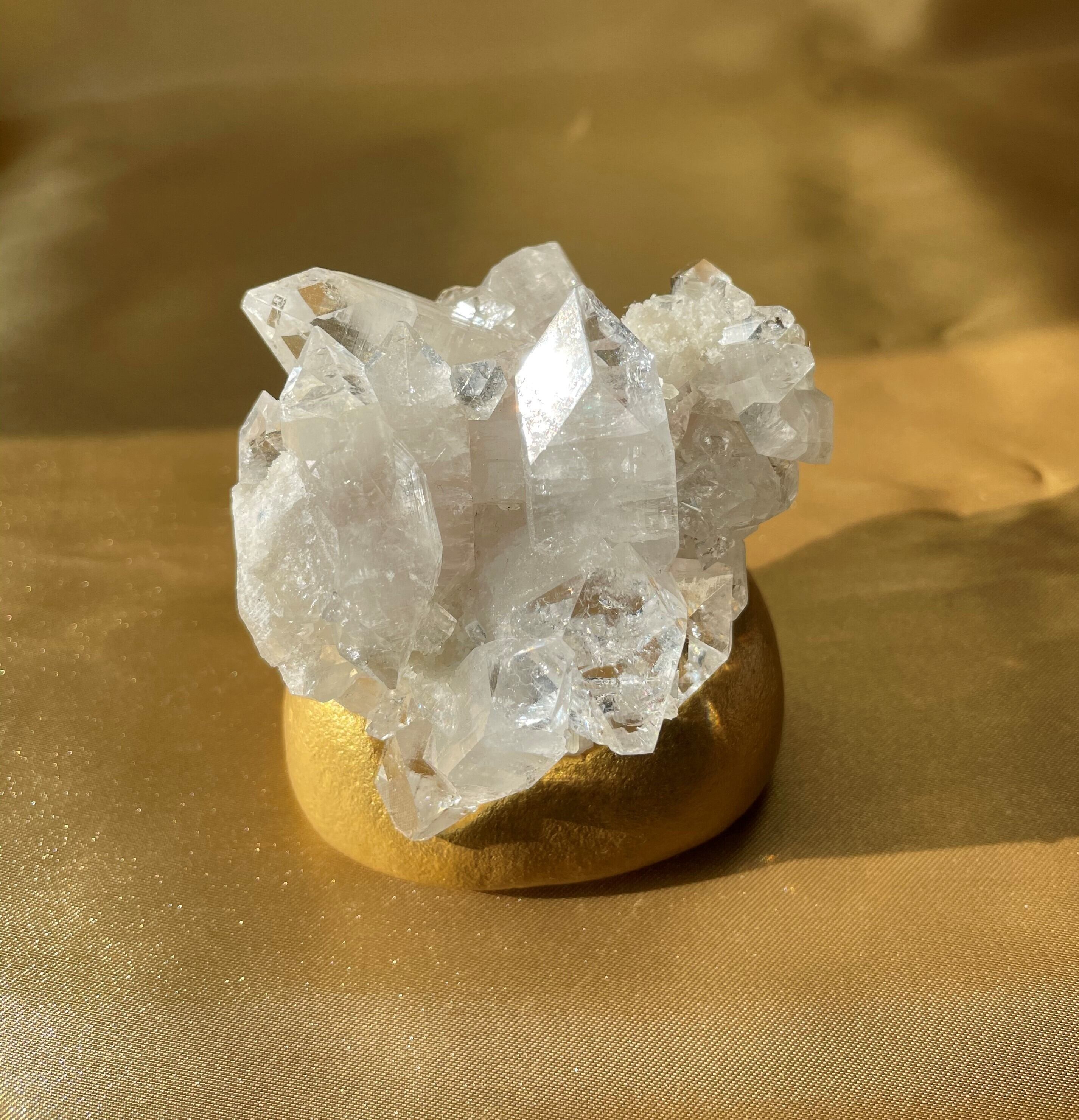 綺麗なアポフィライトの結晶が折り重なって集合したアポフィライトクラスターです。クリアで美しい輝く光を発してくれます。