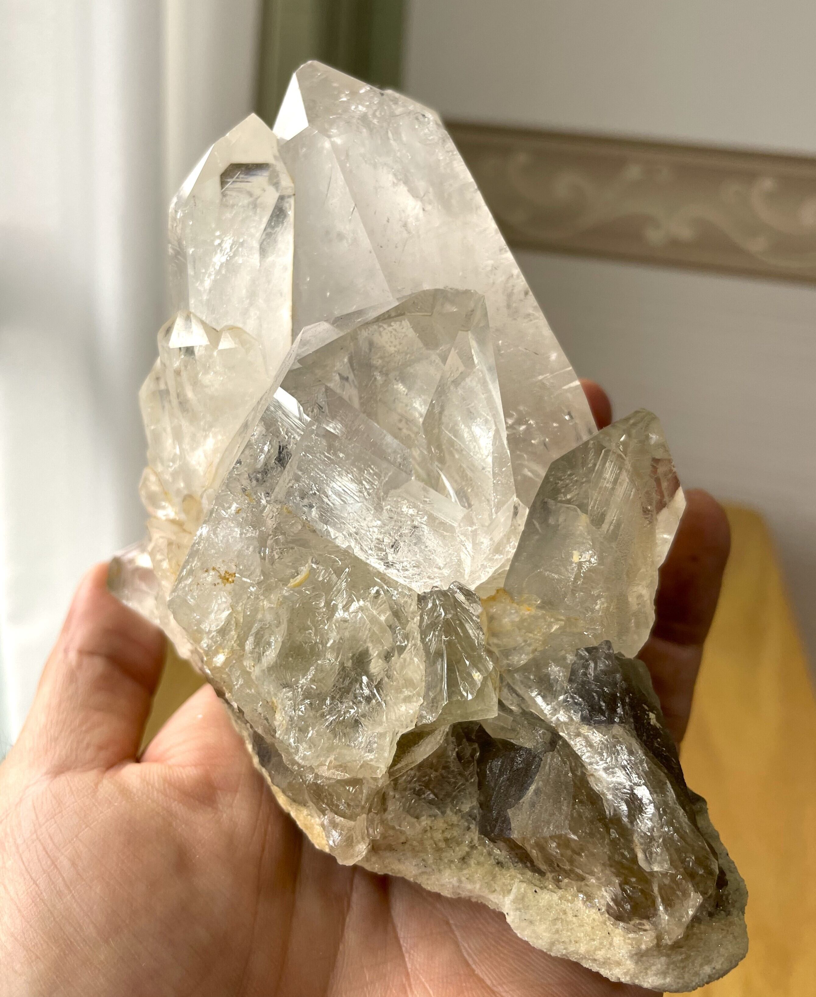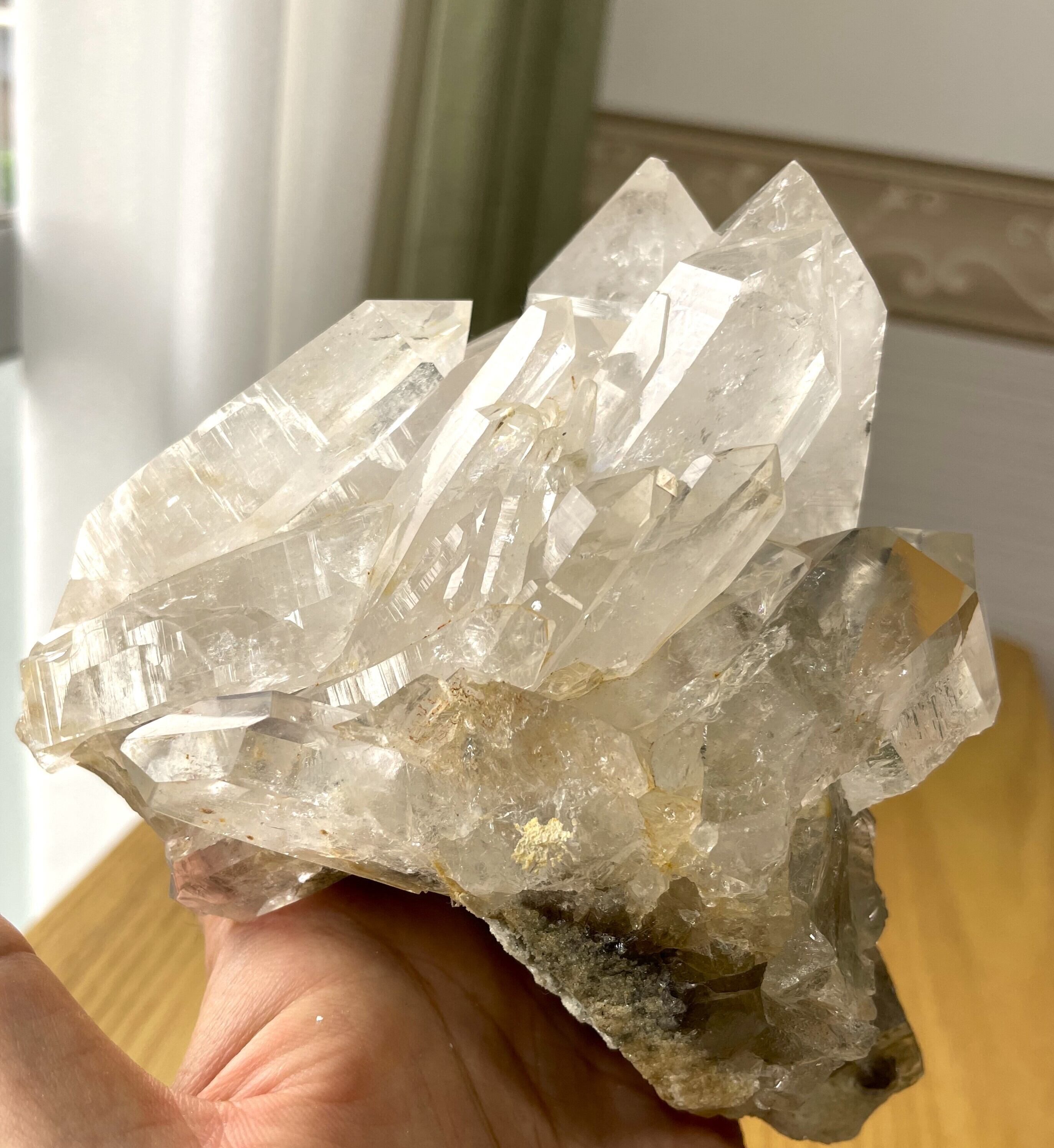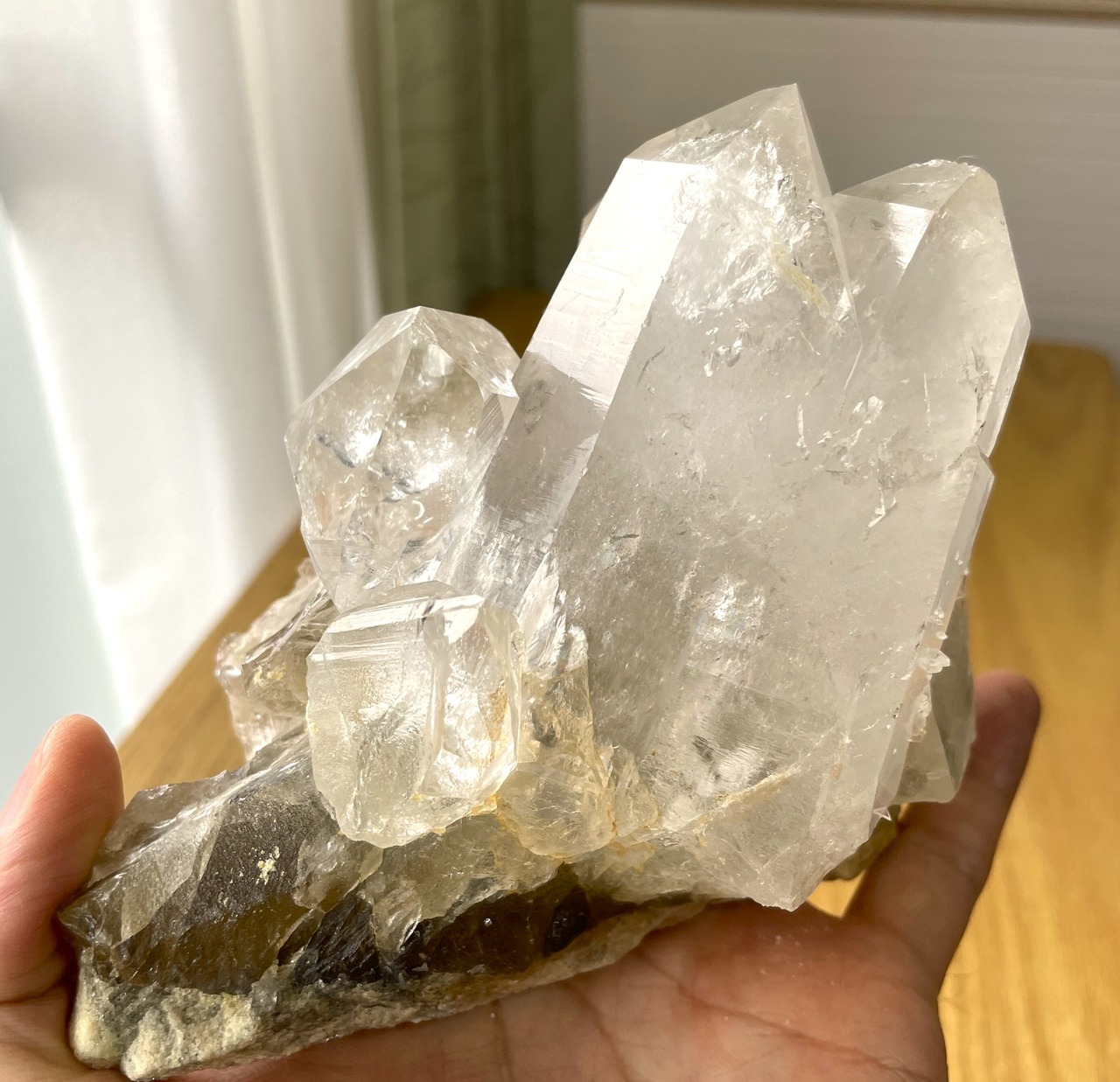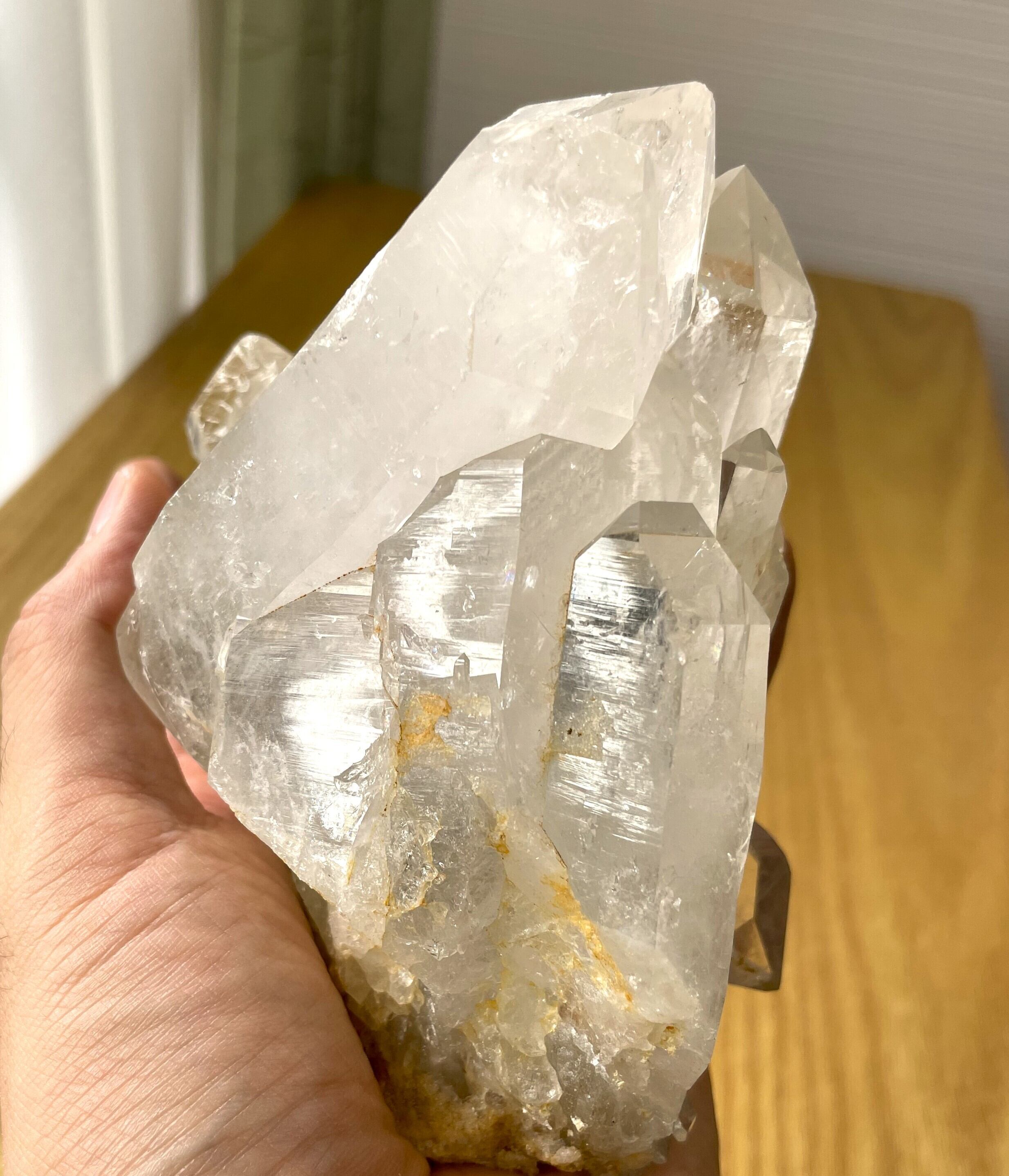 太いツインの水晶を中心にいくつものクリスタルが重なり合い調和しています。