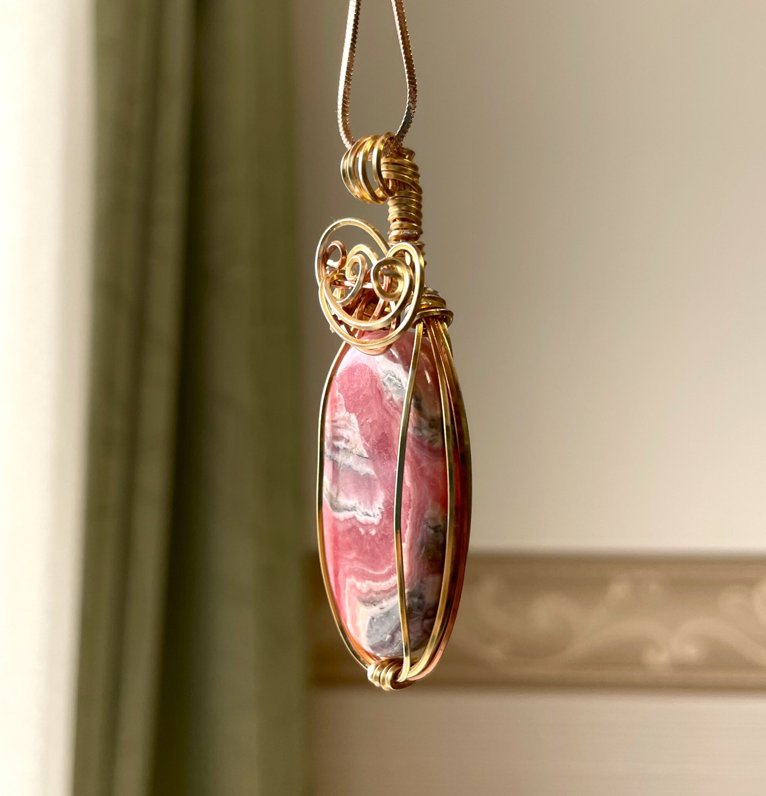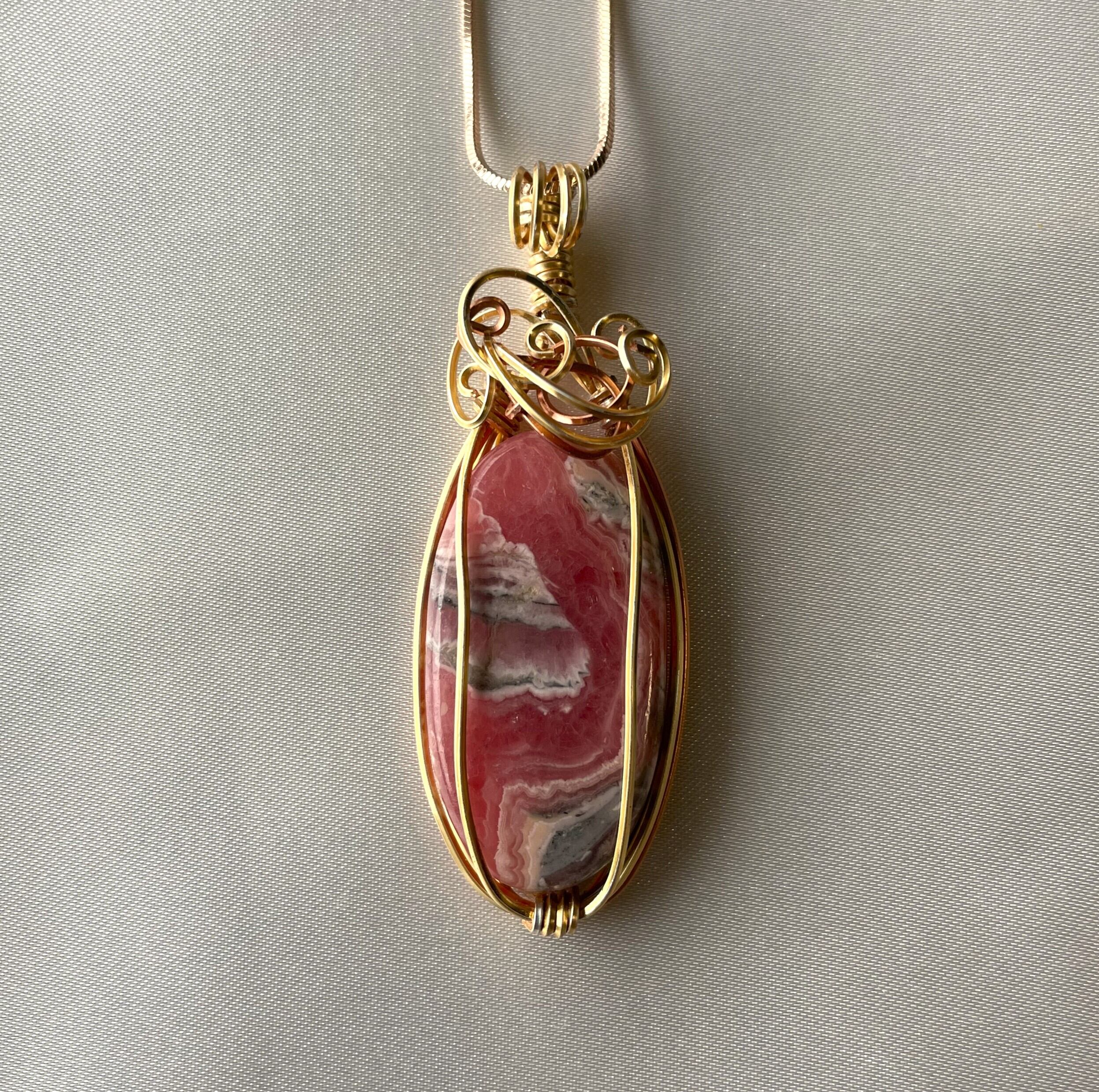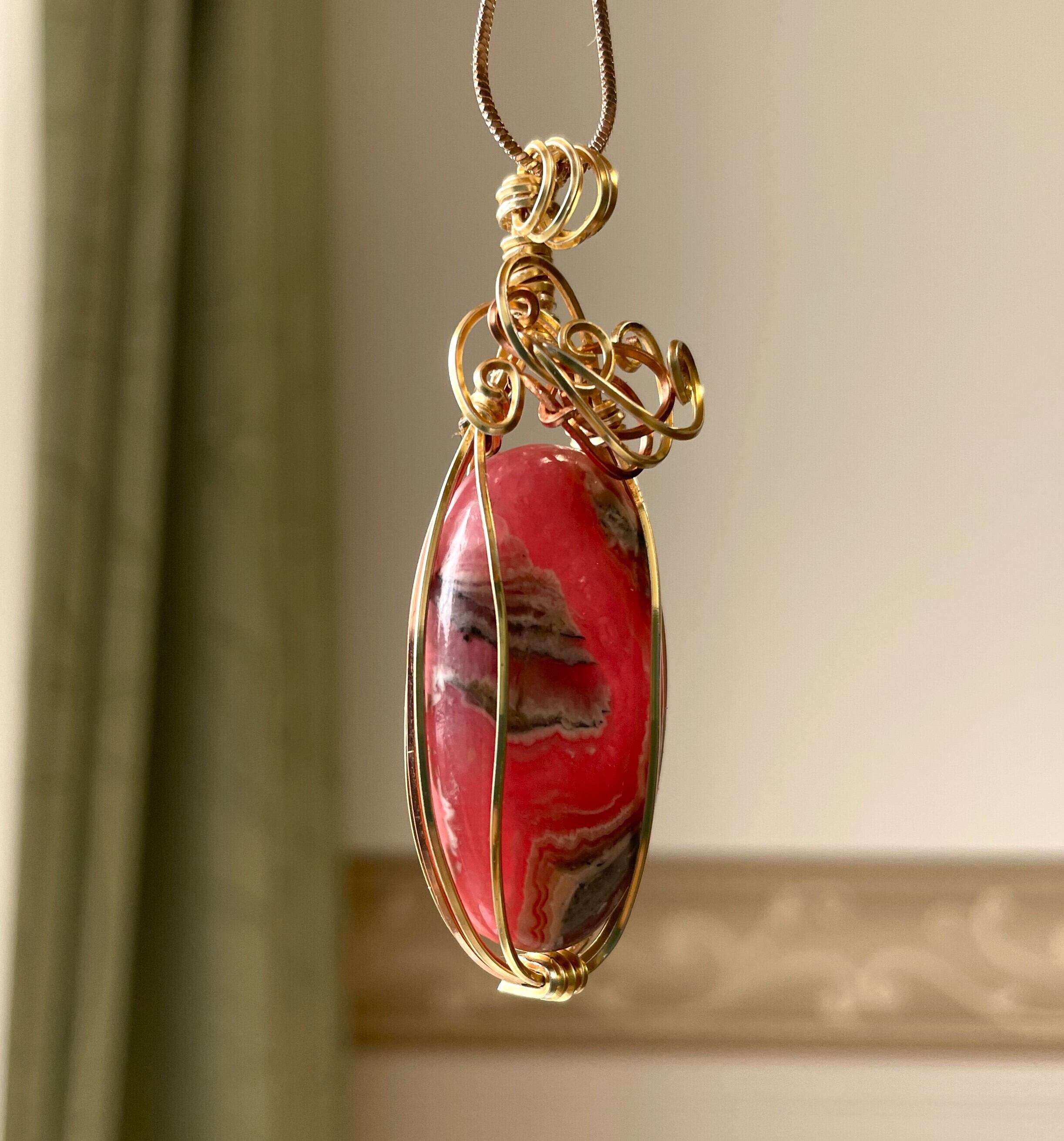 高品質なインカローズ、ロードクロサイトをアーティストワイヤーにてペンダントに仕立てました。(ペルー産)