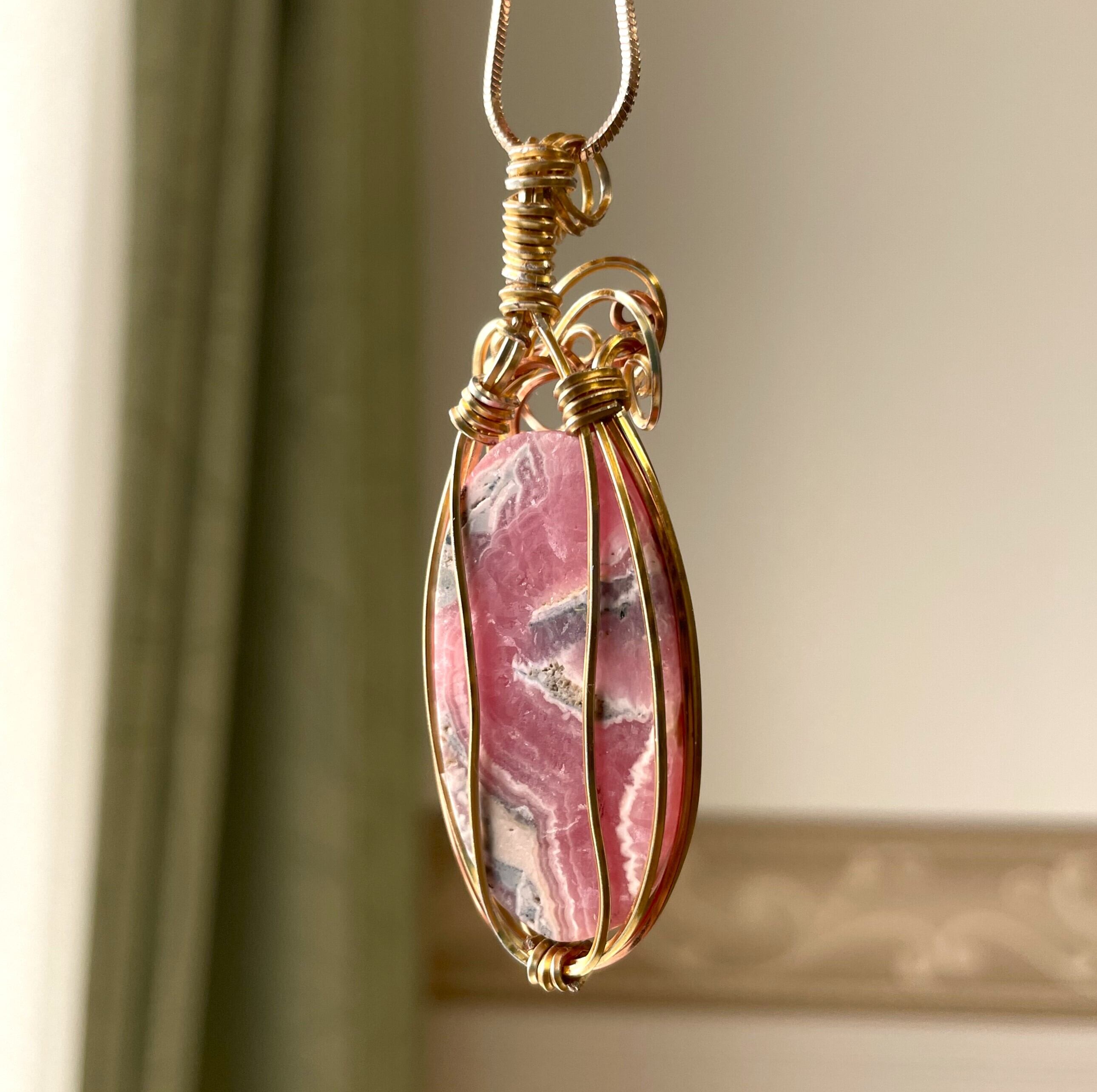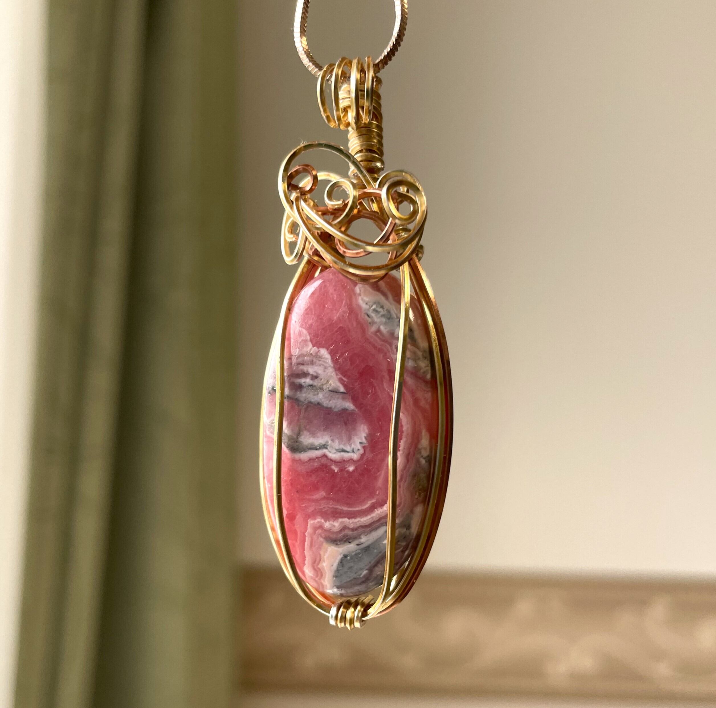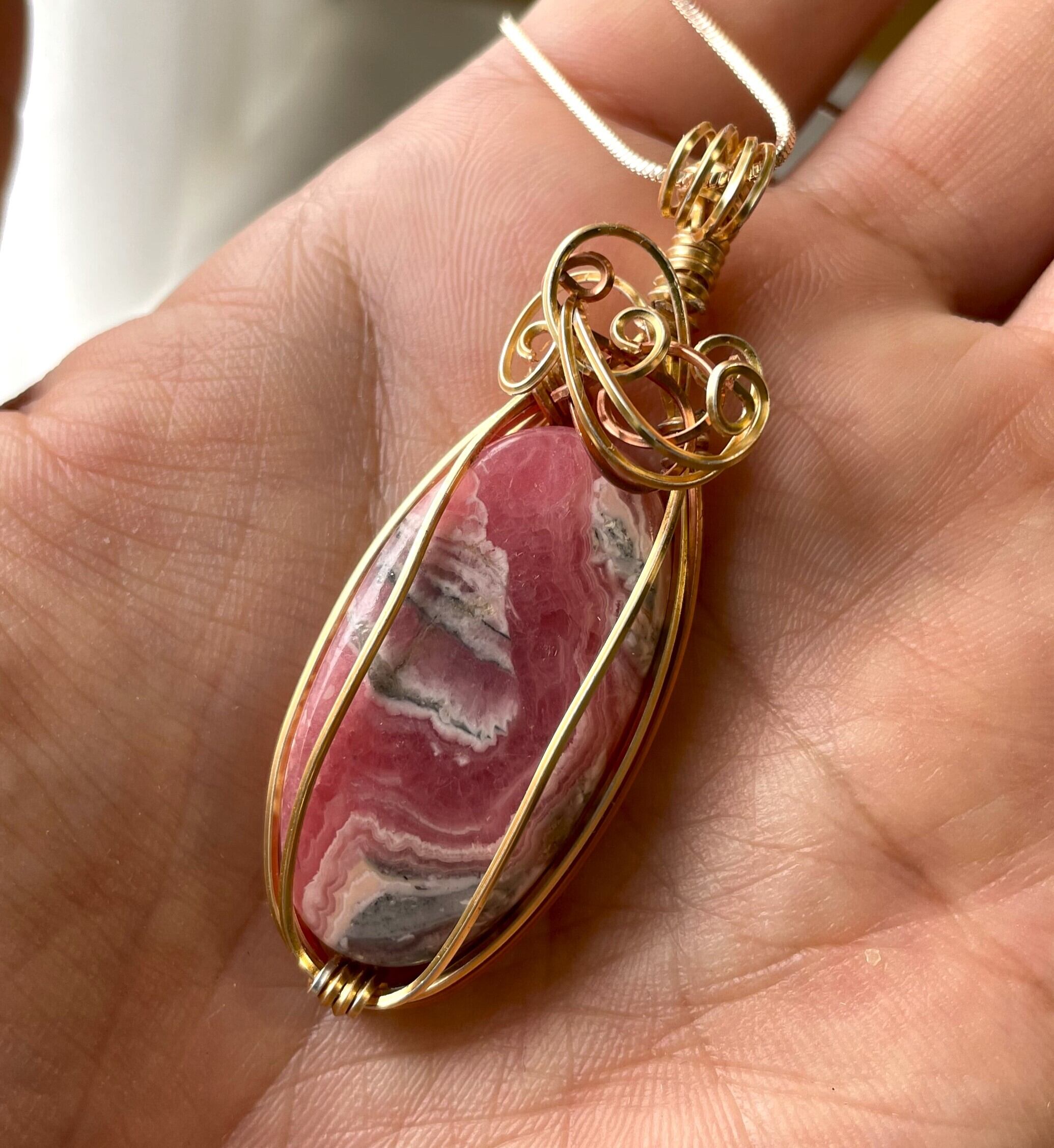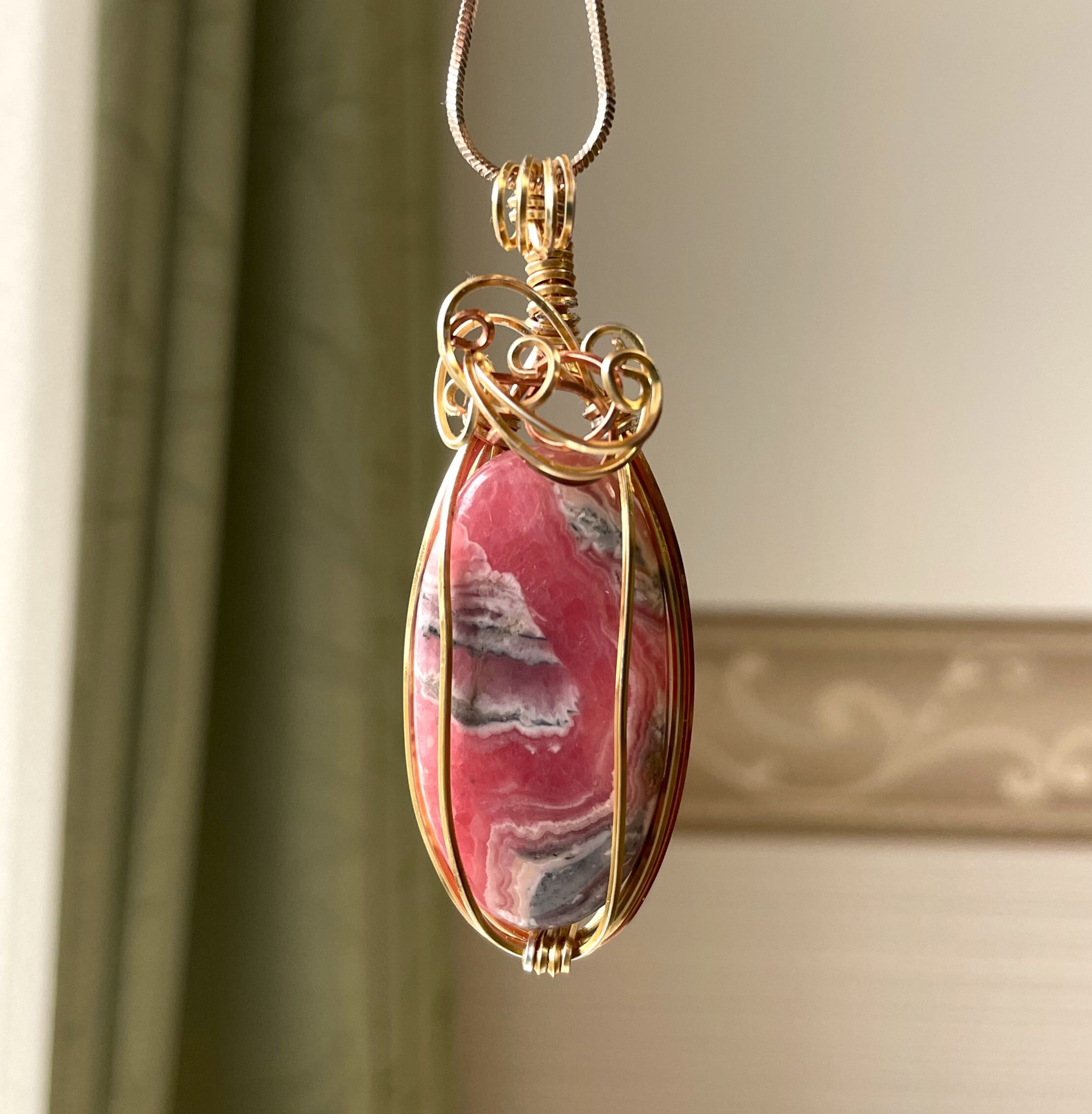 高品質なインカローズ、ロードクロサイトをアーティストワイヤーにてペンダントに仕立てました。(ペルー産)