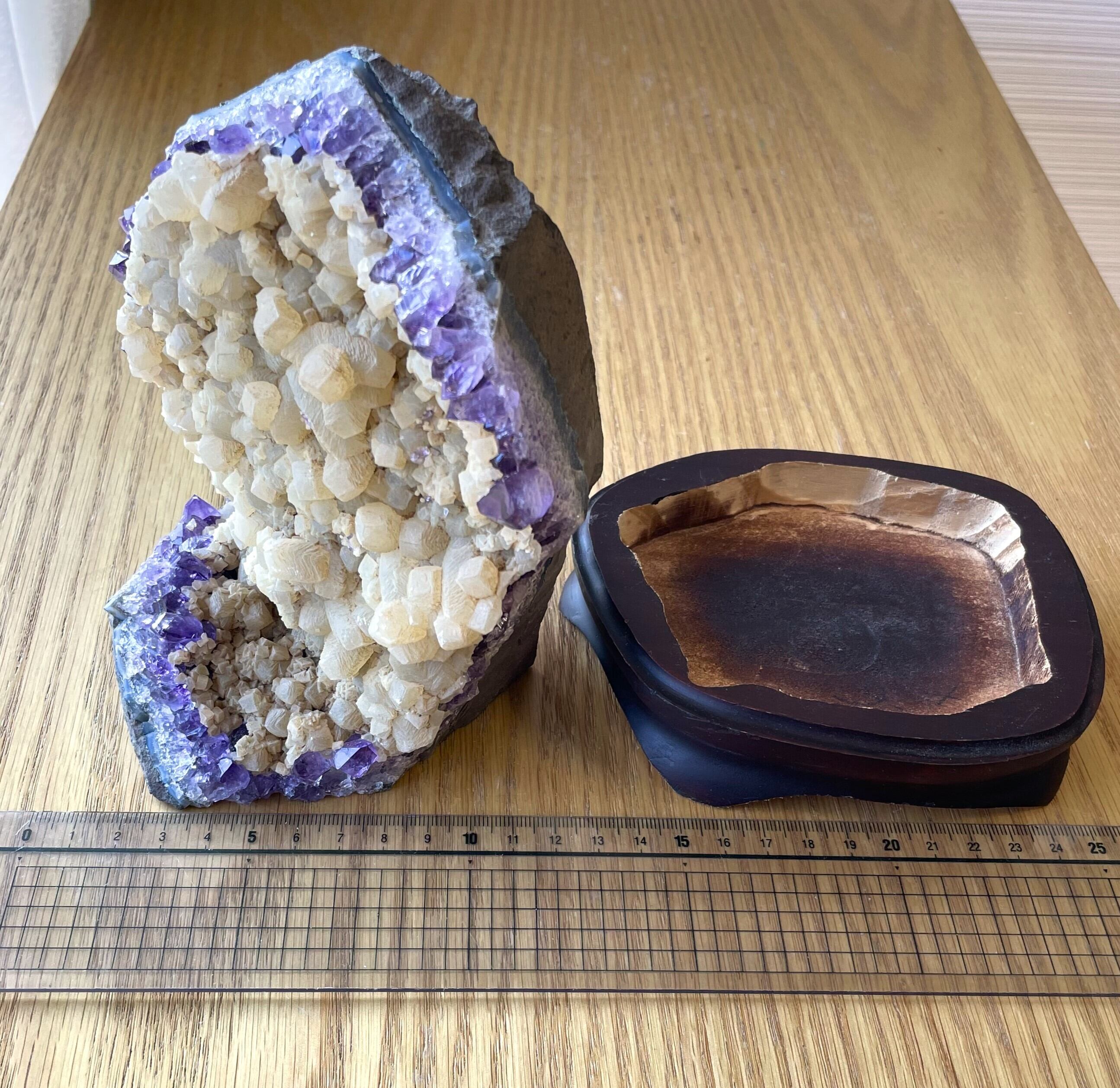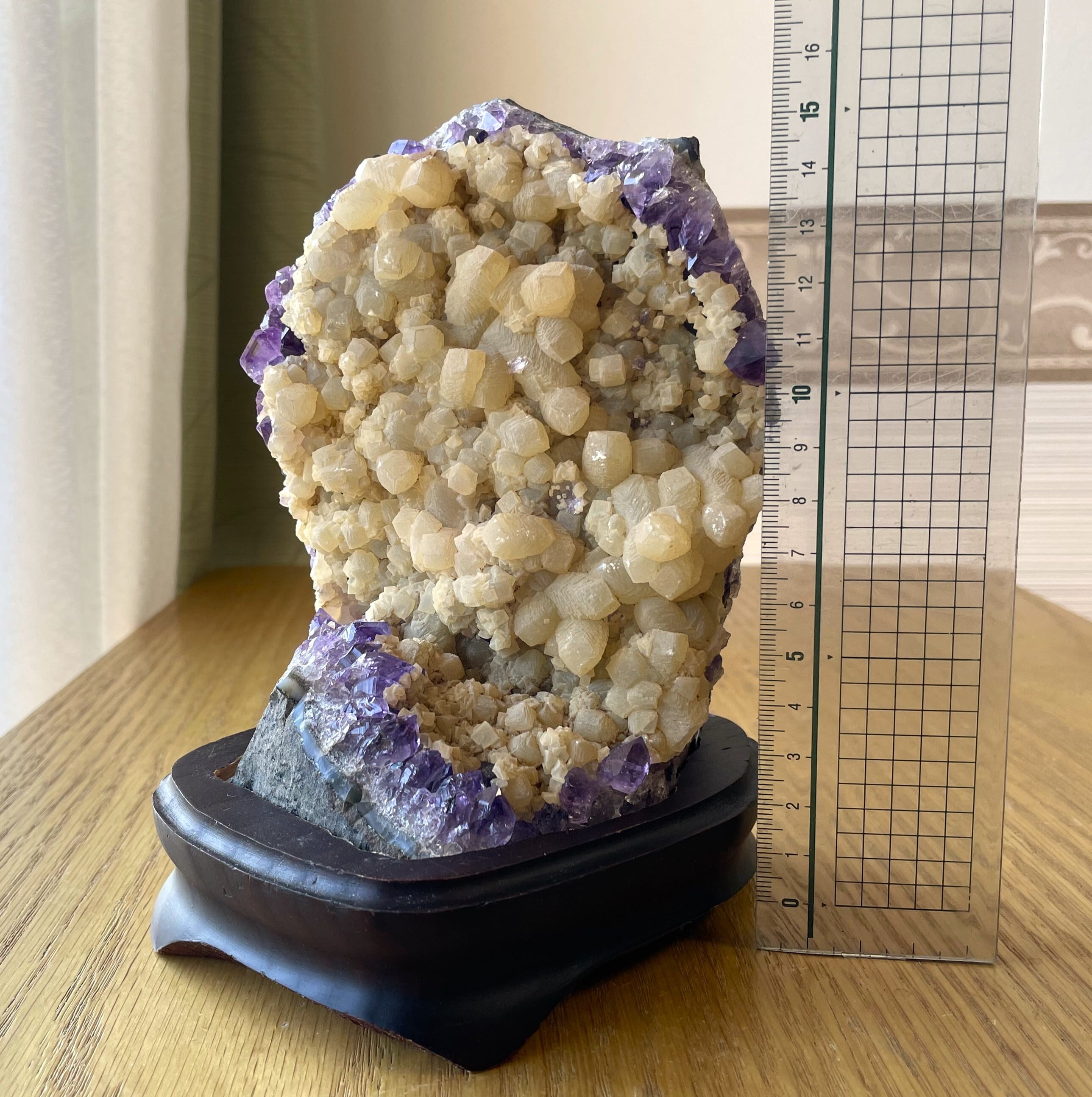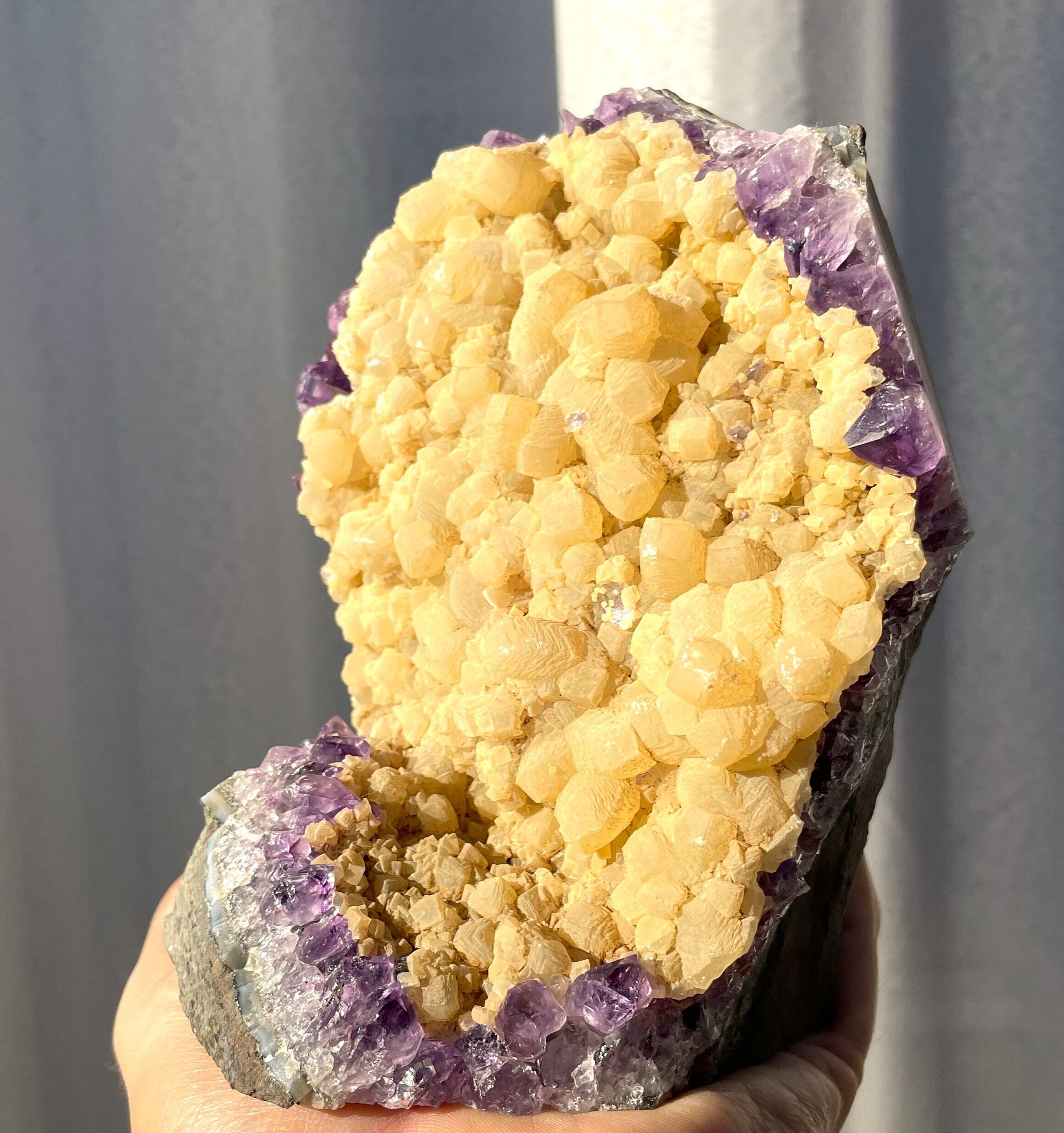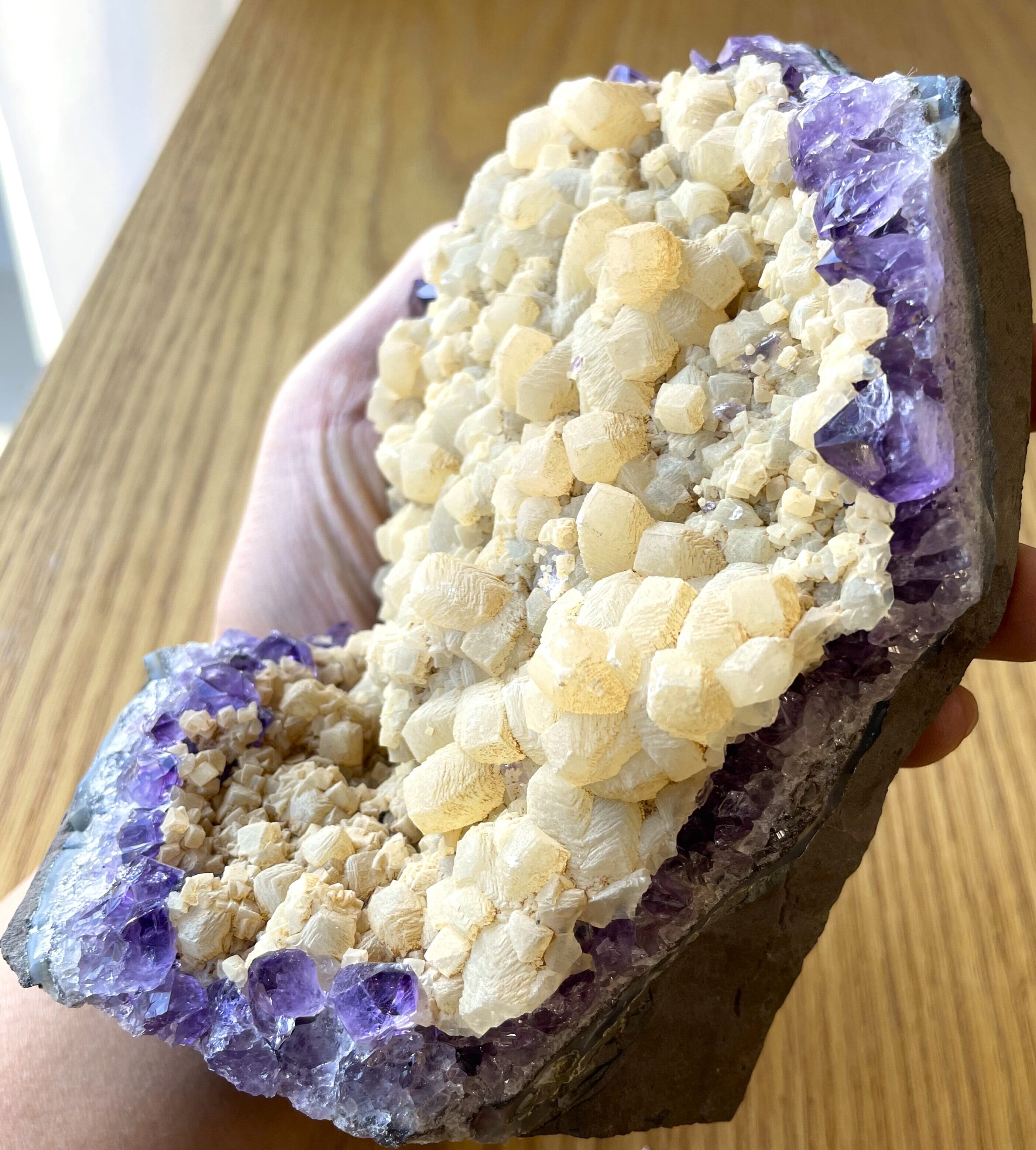 愛の癒しエネルギーのアメジストと豊かさの象徴 カルサイト。長期に渡りメンテナンスしてきました。天然石がお好きな方へ。