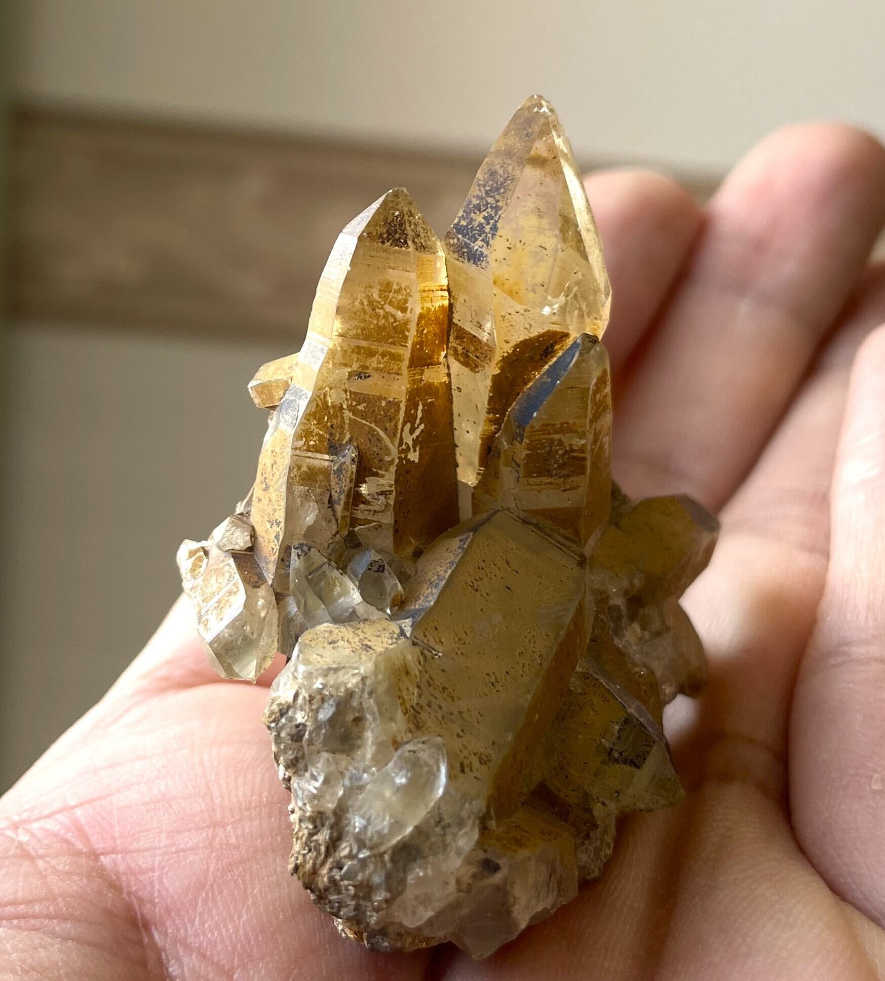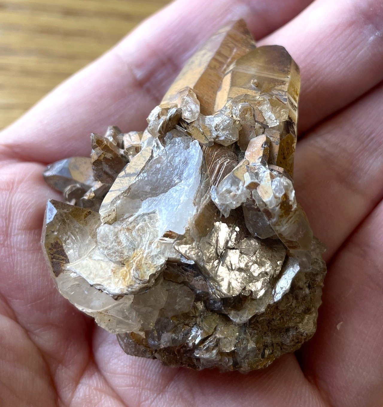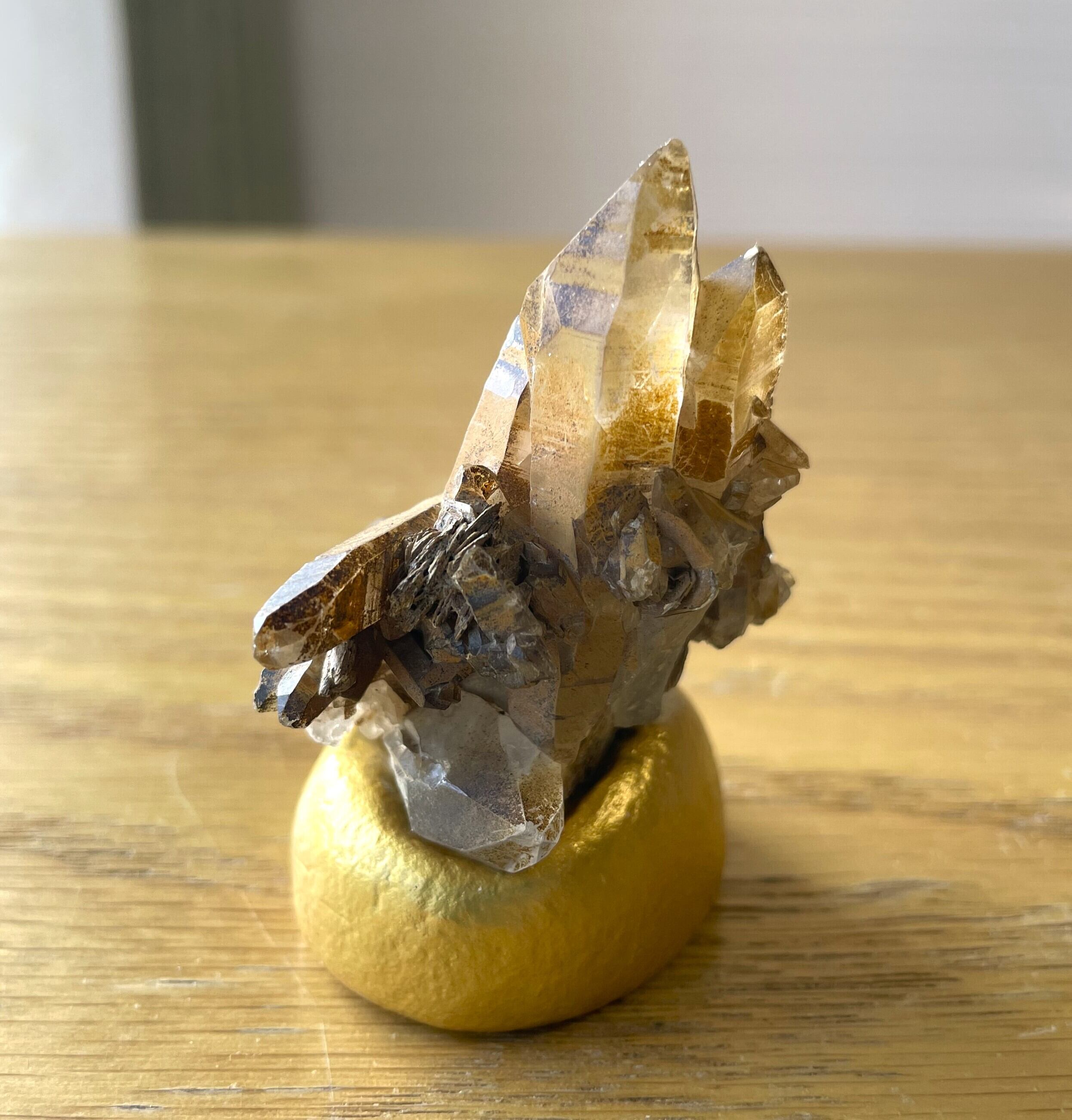 土の成分を表面に残したゴールデンヒーラータイプです。抜群の透明度が美しいタイプと複数の水晶が共生しているタイプで、後者は銀色に輝く雲母もあり印象的です。