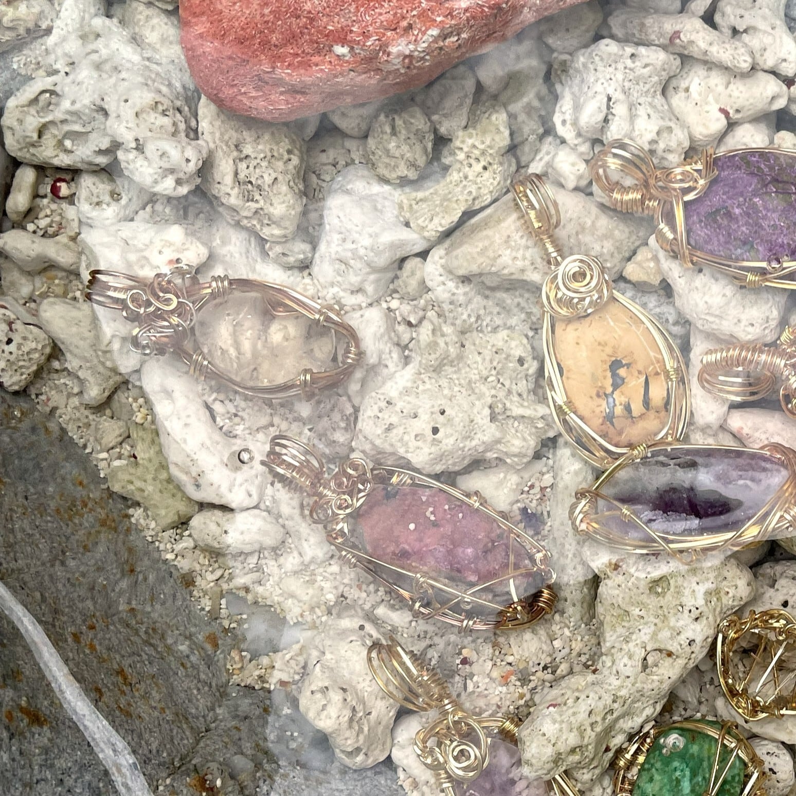 薄っすらとイエロー色が入ったライトシトリン水晶をアーティストワイヤーにてペンダントに仕立てました。