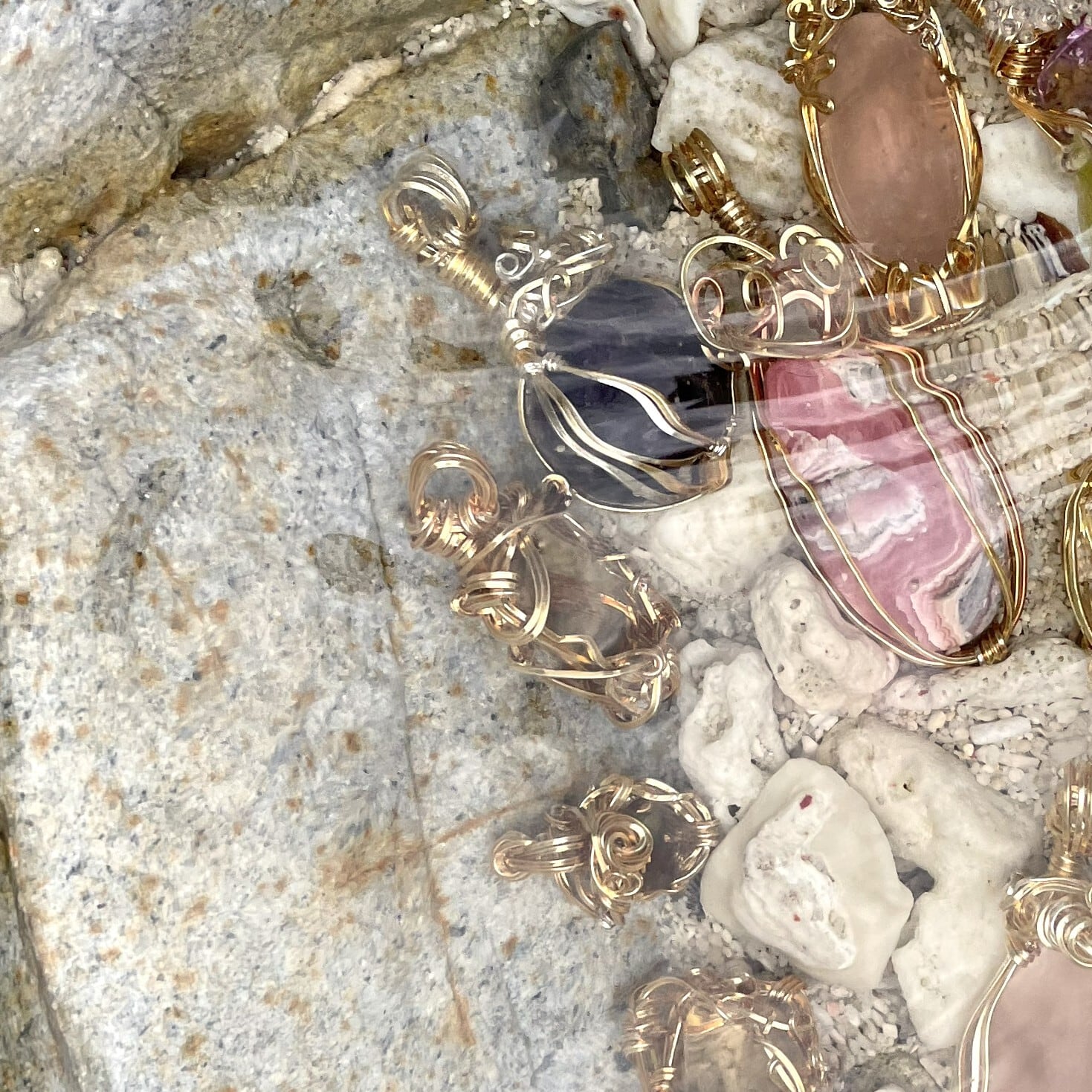 豊かさの色彩、イエローブラウン色の水晶をアーティストワイヤーにてペンダントに仕立てました。
