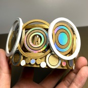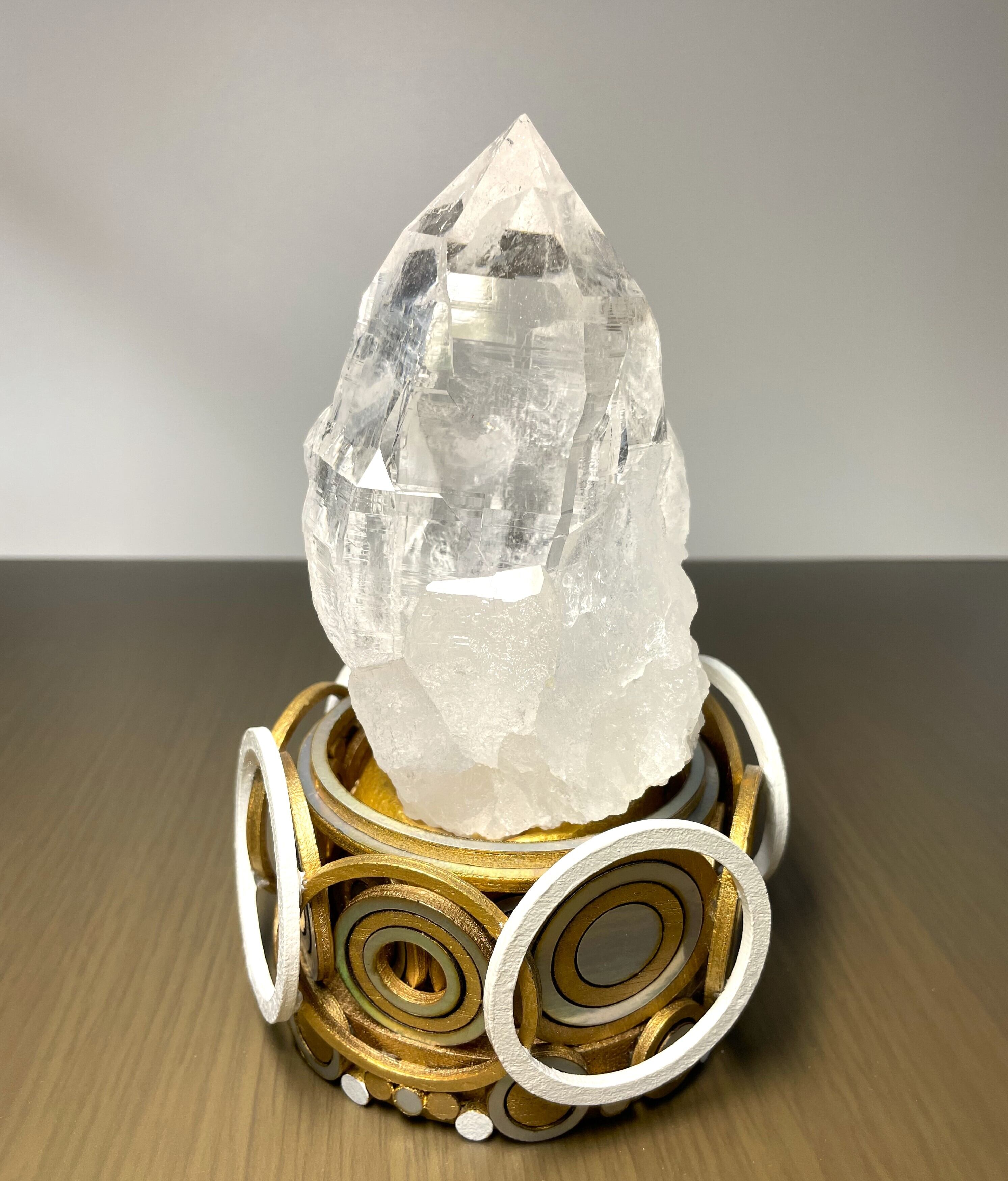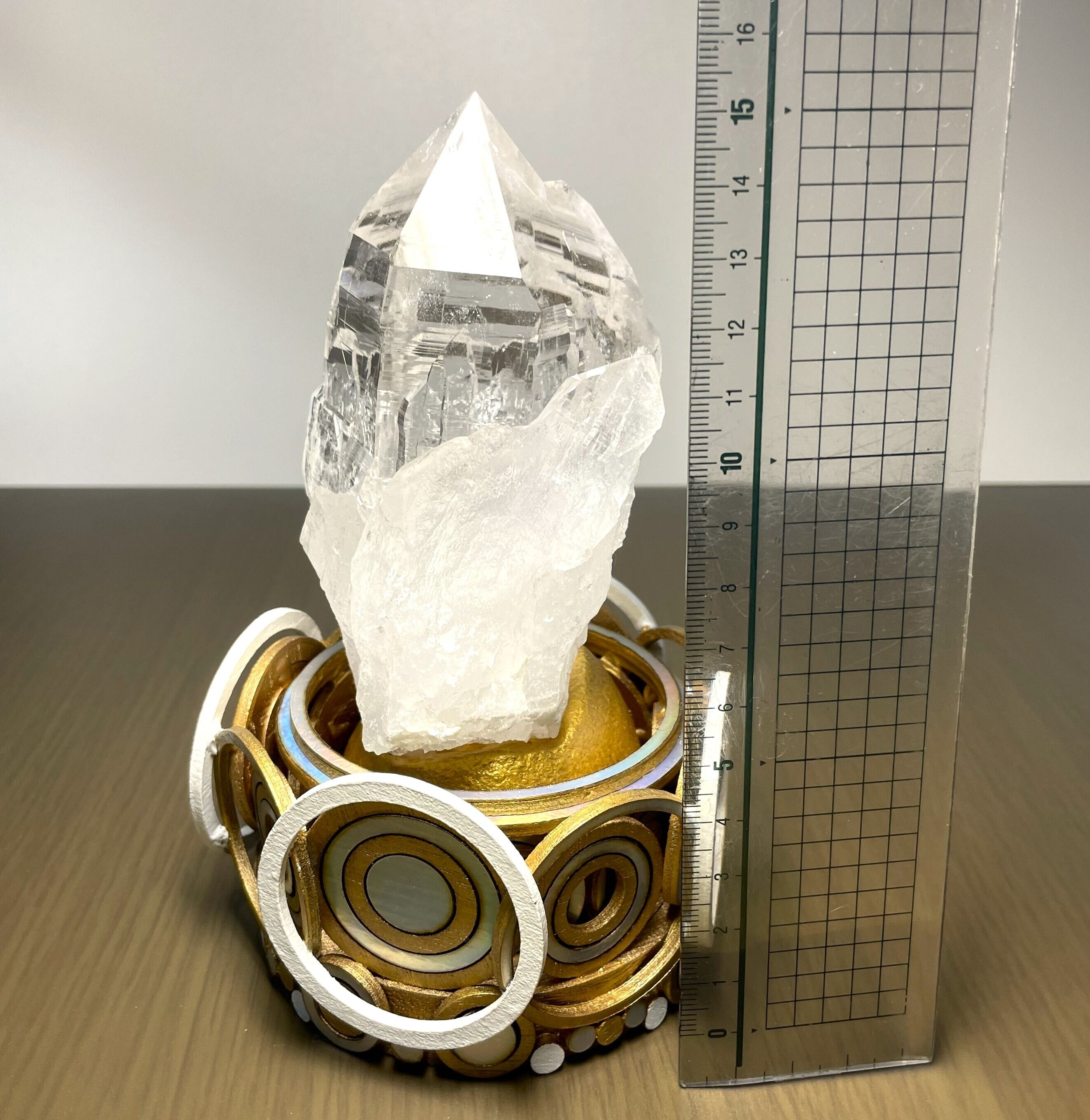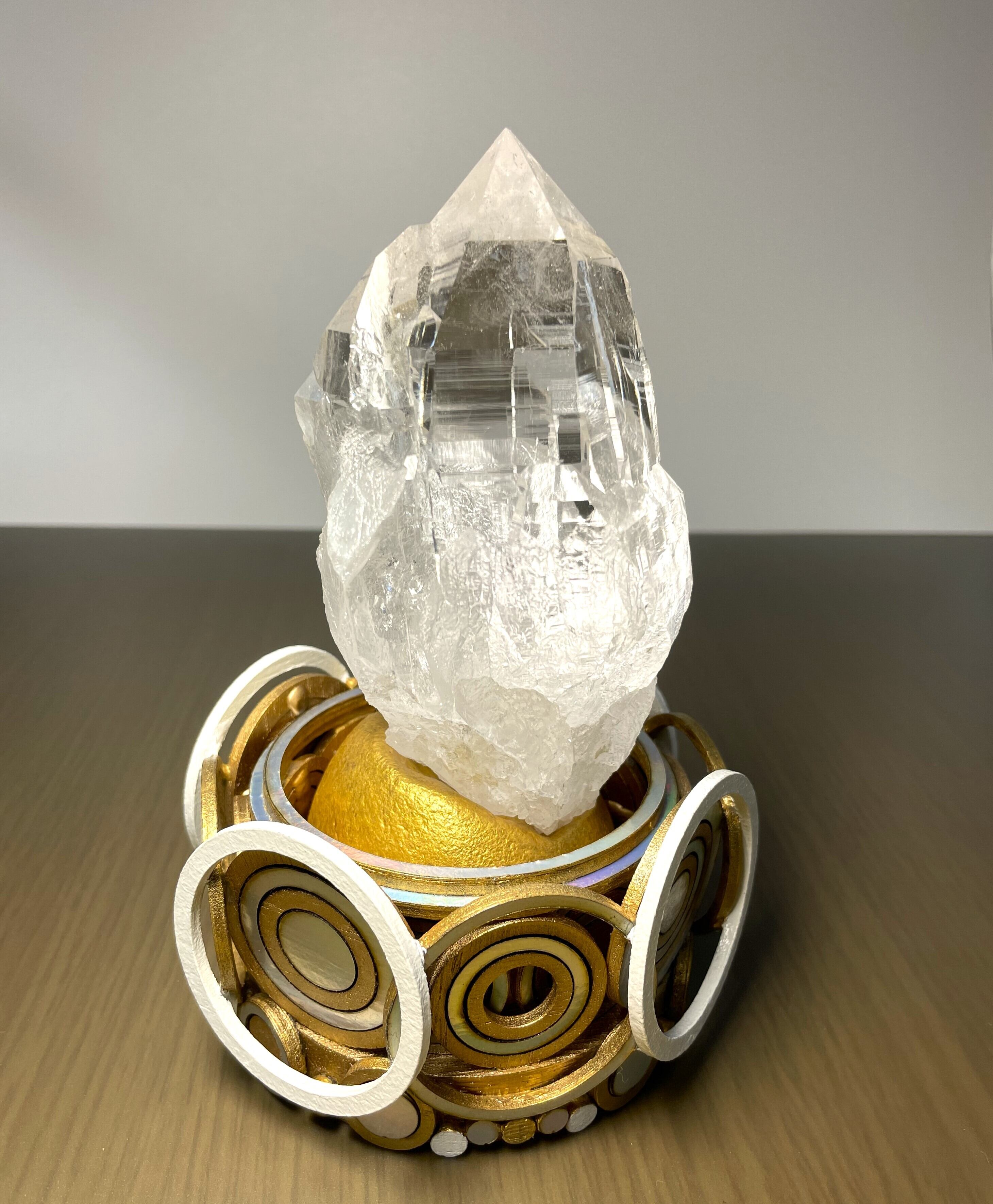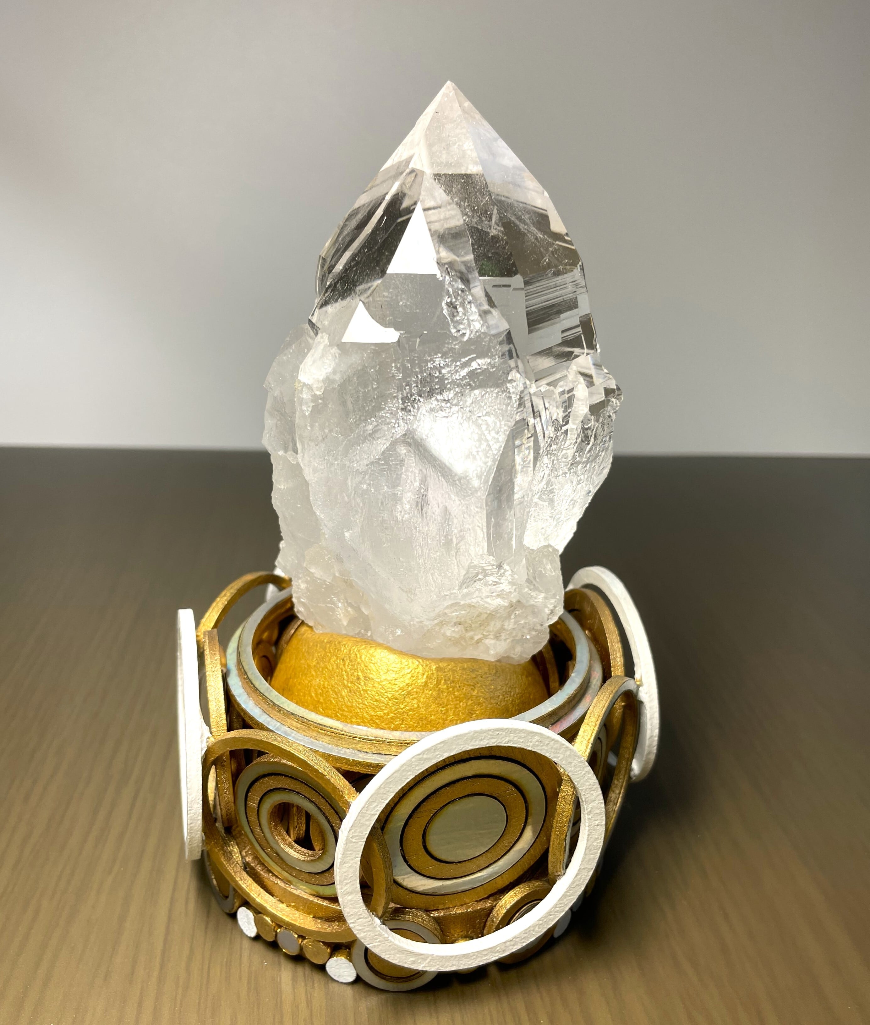 大切なクリスタルに見合うように、木製の美しい専用台座を制作致しました。ゴールド&ホワイト 反射によってレインボーに輝きます。細部まで丁寧に仕上げたハンドメイド1点物。