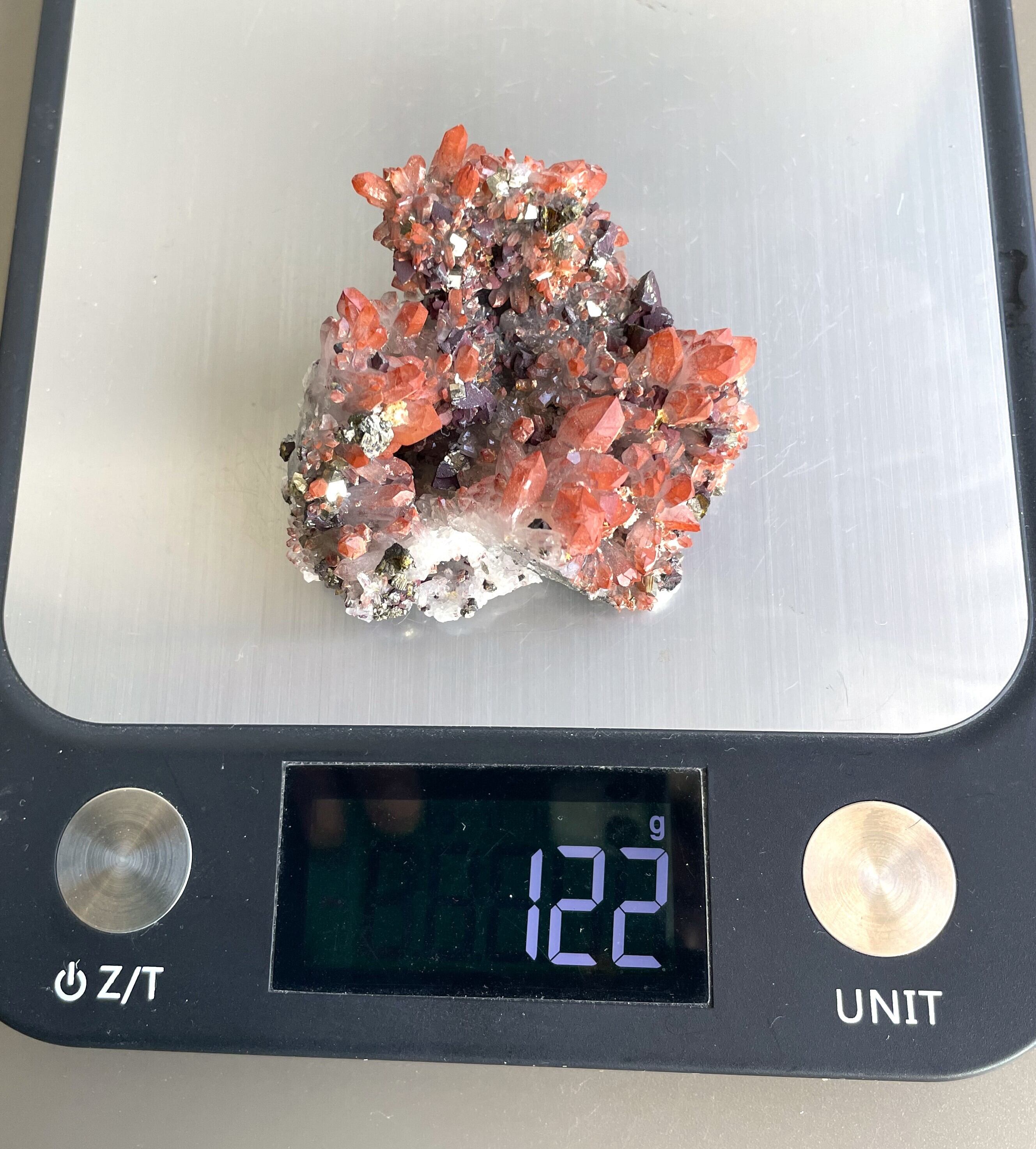 ご覧の通り見事な赤水晶(レッドクリスタル)と黄鉄鉱(パイライト)の共生クラスターです。