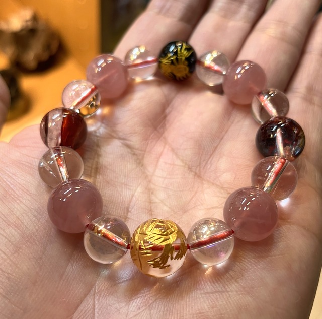 こちらはご注文品となります。ご依頼者様以外のご購入はご遠慮くださいますようお願い申し上げます。 【石の構成】 金龍水晶 約12mm 1石 マダガスカル産ローズクォーツ 約12mm 4石 エンジェルオーラ水晶 約10mm 4石 レッドオーロラ水晶(ライモナイトインクォーツ) 約12mm 2石 クリア水晶 約10mm 4石 黒龍水晶 約12mm 1石 ※ブレスの腕まわり(内径のサイズ)は約13.5-14cmです。伸縮性があります。 【メンテナンス】 最高の状態を保つためにもメンテナンスは必要です。水道水で構わないので流水(チョロチョロでも可)にて30分~60分浄化した後、月光浴でのエネルギーチャージをおすすめします。(日光浴は長時間行うと色あせの原因となりますのでご注意ください) クリスタルが疲れてきたかなと感じたら、こまめなメンテナンスをすることで、ピカピカに輝いてパワフルなサポートを継続してくれます。 私は石が大好きなので良い状態でお渡しすることを約束します。加えて龍とともにエネルギーチャージを実施後にお送り致します。 石にも意思があり、強く魅力を感じた方は石に呼ばれています。そういう出会いは良い結果を生みますのでお迎えをご検討ください。必要な方のお役に立てれば幸いです。 天然石のためインクリュージョン(内包物)やクラック(亀裂)、細かなキズなどがある場合もあります。本物の天然石であるという証明です。 画像をよくご参照頂ければと思います。また光の加減で色味が変わって見えることもあります。あらかじめご了承の上でご購入お願い致します。 送料無料で発送します。その時に応じた発送方法となりますので運送方法の指定はできませんのでご了承ください。海外へは発送いたしておりません。